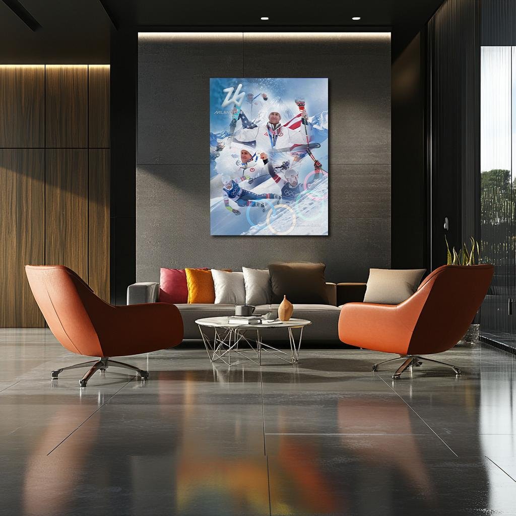 The artwork translates these numbers into geometry. Alpine skiing is inherently diagonal; the athlete’s body forms a forward-angled vector parallel to the slope’s fall line. Knees compress into the terrain; skis flex under load; poles trail backward in aerodynamic alignment. The painting layers multiple exposures of Cochran-Siegle: poised at the 1,959-meter start gate, mid-descent carving across the 2.414-kilometer course, and finally elevated on the podium with silver medal displayed. Preparation, execution, and resolution coexist within a single visual axis.