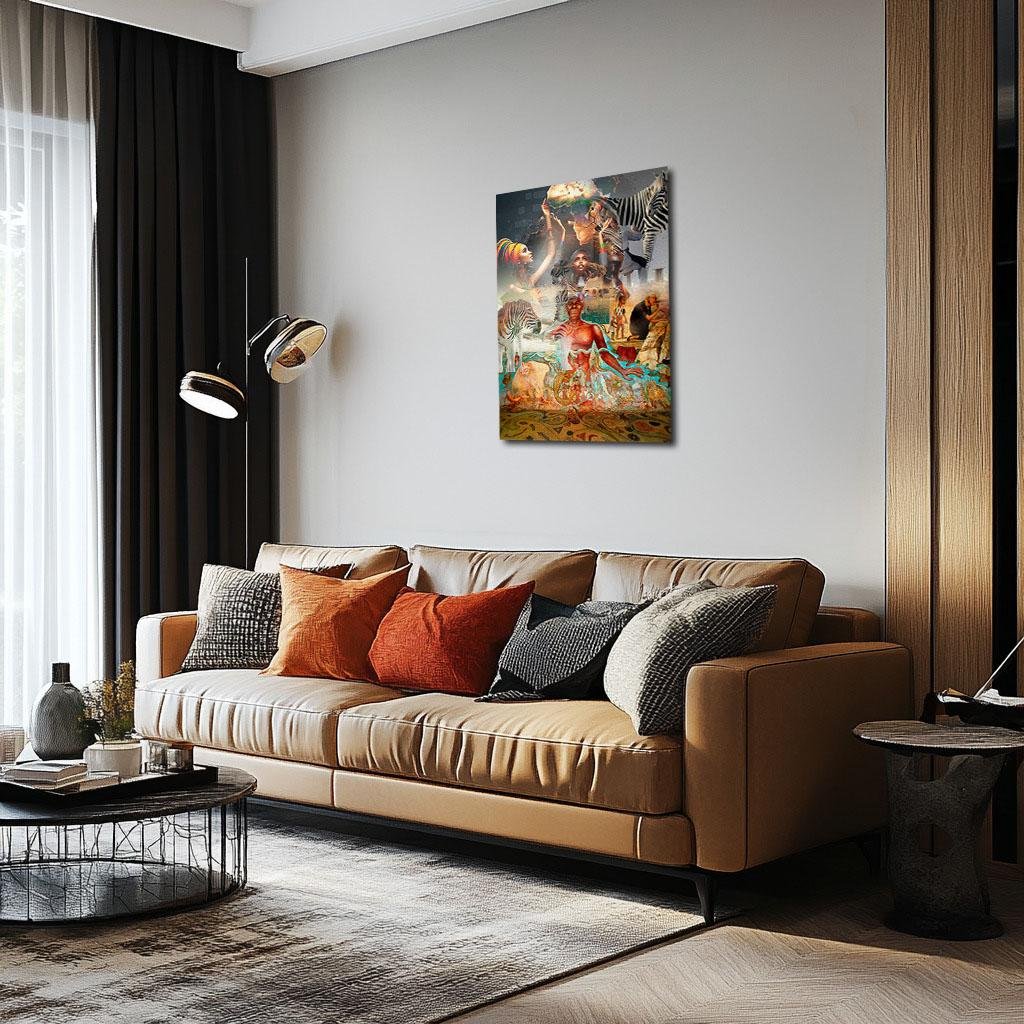 Ancestral Currents reimagines Diego Rivera’s Figure Symbolizing the African as a sweeping symbolic meditation on identity, rebirth, and the elemental strength of heritage. A seated male figure anchors the earth, while divine feminine forms rise above, lifting a glowing African continent cracked by history and ignited by spirit. Zebras walk through myth and mist, mosaics whisper legacy, and the entire canvas pulses in hues of copper, turquoise, and galactic black. This surrealist reconstruction transforms the continent into a sacred orbit of memory, resistance, and enduring grace.