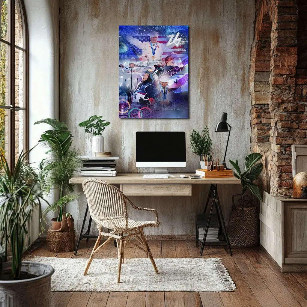 At the 2026 Winter Olympics in Milano Cortina, Jake Canter of the United States won Bronze in Men’s Snowboard Slopestyle with a best score of 79.36 at Livigno Snow Park. Competing against 30 athletes from 14 nations, he secured third place behind Su Yiming (82.41) and Taiga Hasegawa (82.13). Rendered in bronze light against alpine blue, this artwork captures the precise moment where amplitude, control, and composure converge into Olympic permanence.