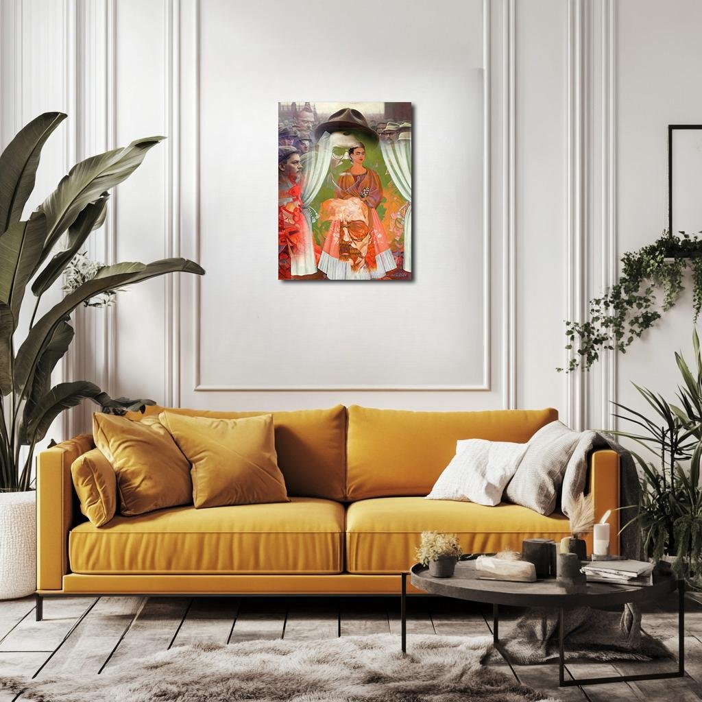 The compositional rhythm unfolds downward: the eye is drawn first to the clear, unwavering presence of Frida, then to the heavy, dissolving layers of Trotsky and the crowd behind her. The curtains frame this descent, emphasizing the passage of the viewer from present to past, from clarity to haze. They fall like silent veils over the scene, suggesting that history, no matter how brightly lived, eventually falls into the soft obscurity of recollection.