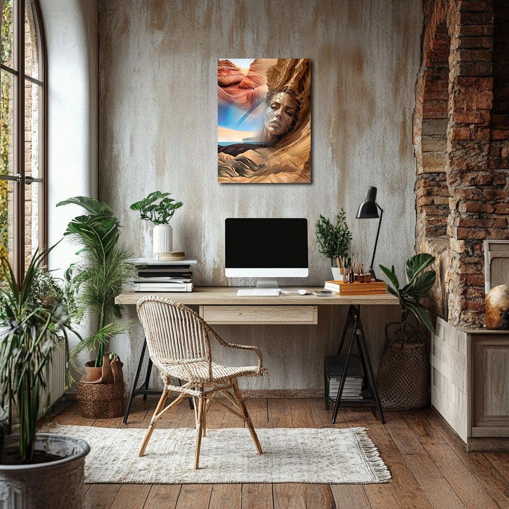 The image evokes the intimate connection O’Keeffe had with the land near Abiquiu, where she lived for many years and found endless inspiration in the bone-white mesas and warm, rolling hills. This reinterpretation takes her spatial language and renders it as emotional topography—here, the land does not simply reflect mood; it is the mood, it is the body. The woman’s face emerges from a swirling canyon, her expression both peaceful and worn, suggesting not sorrow but ancient knowledge. Her features resemble cracked clay, symbolic of age, drought, and endurance—yet she remains dignified, restful, still deeply alive.
