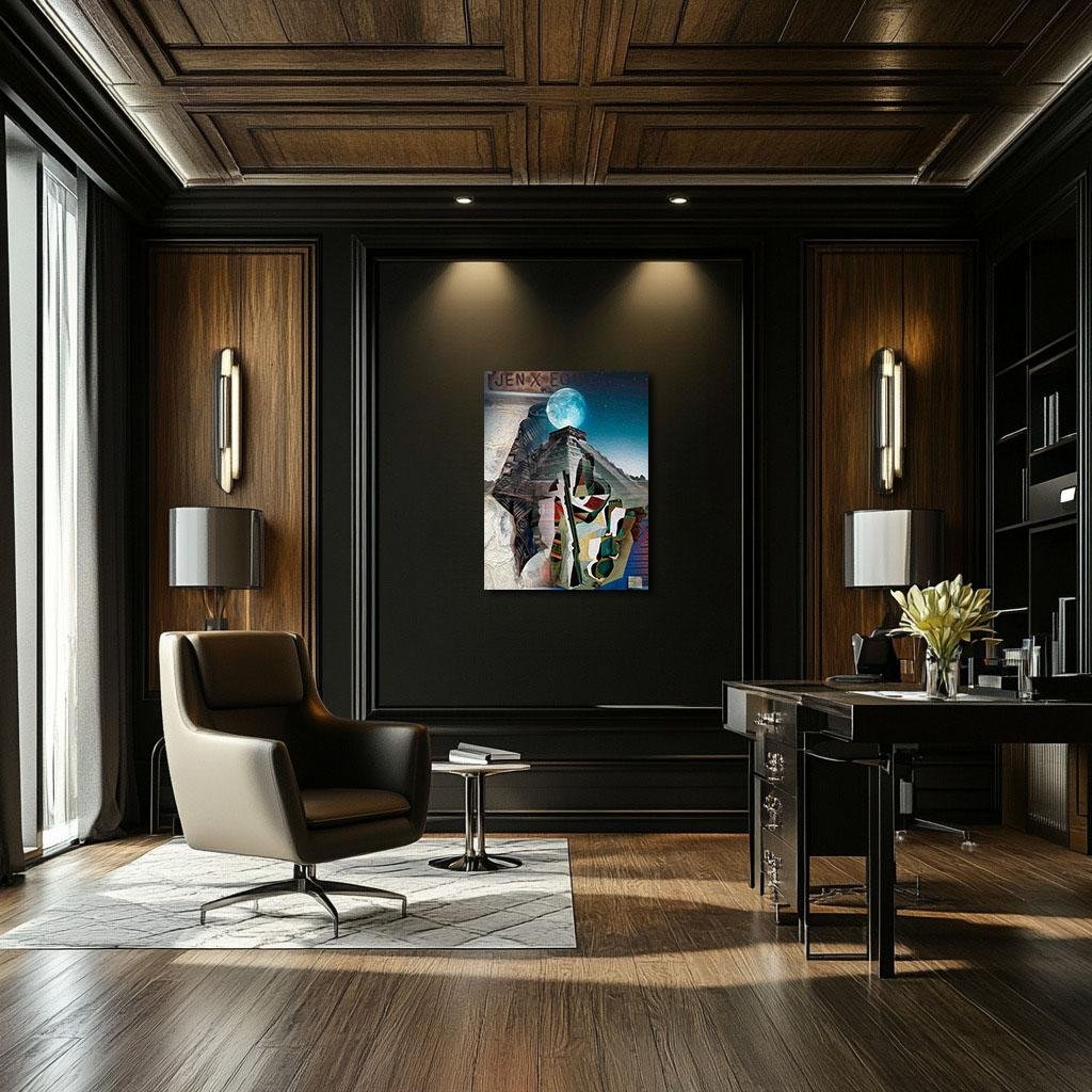Echoes Beneath the Moon reimagines Diego Rivera’s Zapatista Landscape as a mystical meditation on resistance, memory, and ancestral presence. The iconic cubist soldier stands before a moonlit Mesoamerican pyramid, cloaked in traditional textiles and woven myths. Through indigo skies, earthen stone, and surreal fragmentation, the piece merges revolution with ritual, transforming the rifle into a relic of continuity and the moon into a witness of time. This symbolic homage speaks not only to struggle, but to survival, identity, and the sacred geometry of legacy.