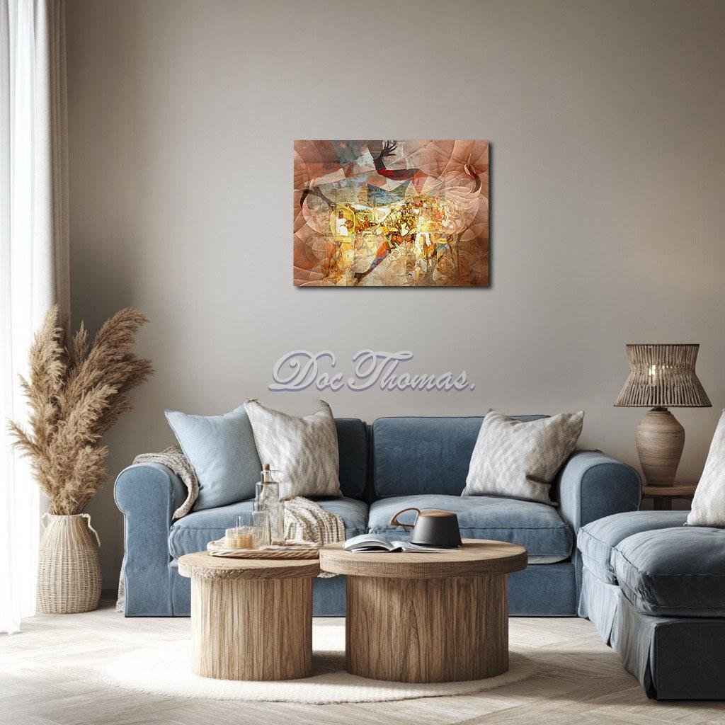 Palacio Nacional in Mexico City, is a monumental tribute to the grandeur of the Aztec civilization. This reinterpretation, Echoes of Empire: Rivera’s Tenochtitlan Reimagined , overlays Rivera’s vibrant and detailed mural with contemporary surrealist abstractions. By blending the historical with the modern, this work captures the essence of Rivera’s vision while inviting a deeper contemplation of cultural identity, history, and the resilience of indigenous traditions in a rapidly changing world.
