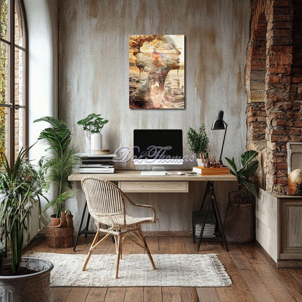 Color in this artwork flows like breath. The honey-gold sky stretches outward, evoking not just light but warmth—an elemental glow of remembrance. Its tones of amber and flax soften the starkness of awakening, offering the viewer a suspended dawn where the soul rests unjudged. The water beneath her, a mirror of molten bronze and cooled steel, suggests the subconscious—reflective, layered, infinite. And within this sea, the Vermeer girl gently floats, cradled by the mind’s inner tides. Above her, trees grow not from ground, but from thought—emerging from the crown of the larger feminine figure like living synapses. These arboreal forms twist in umber and burnt sienna, their roots made not of soil but of time.