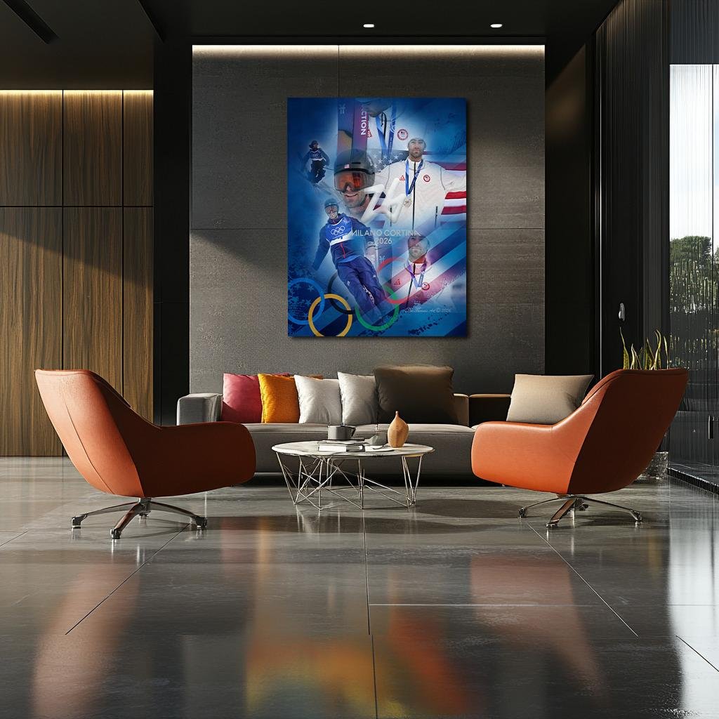 At the Milano Cortina 2026 Olympic Games, Alex Hall earned Silver in the Men’s Freeski Slopestyle Final under the three-run Olympic format, where the best two scores determine final ranking. His medal was defined by high-difficulty rotational combinations, technical rail precision, and compositional continuity across a multi-feature course. Rendered in sapphire gradients symbolizing engineered terrain and restrained silver illumination reflecting decimal-scored proximity to gold, the artwork captures structured creativity measured in Olympic arithmetic.