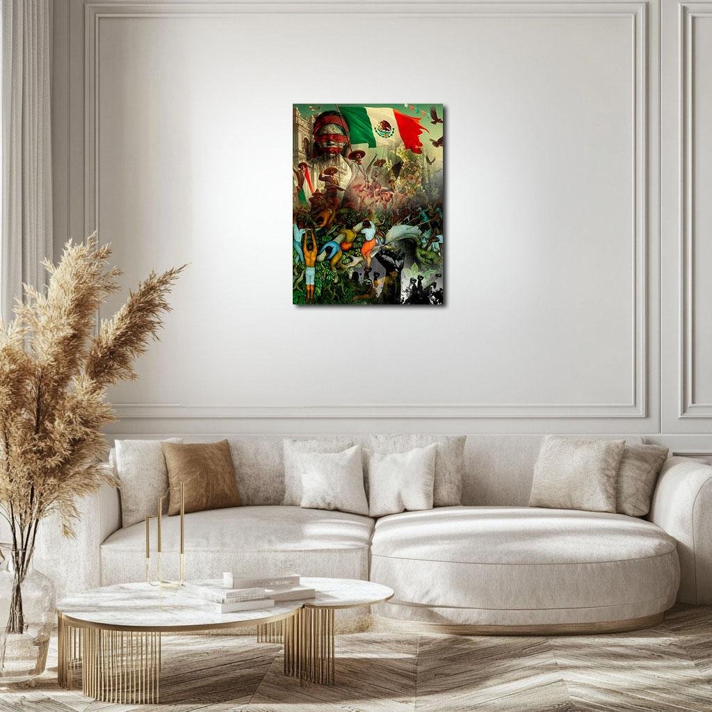Color in this piece is both strategy and soul. The deep, jungle greens below were chosen to remind the viewer of Mexico’s indigenous roots, of land as origin and battleground. The reds in the middle layer burn bright—drawn from Rivera’s revolutionary palette—symbolizing both sacrifice and the fire of collective awakening. The upper registers shift to light gold, copper-white, and a veil of muted sky-blue. These are the colors of paradox: of possibility and forgetting, of heaven and veil, of unity and blindness. The Mexican flag itself, bold in placement and faded at its edge, becomes a question more than an answer.