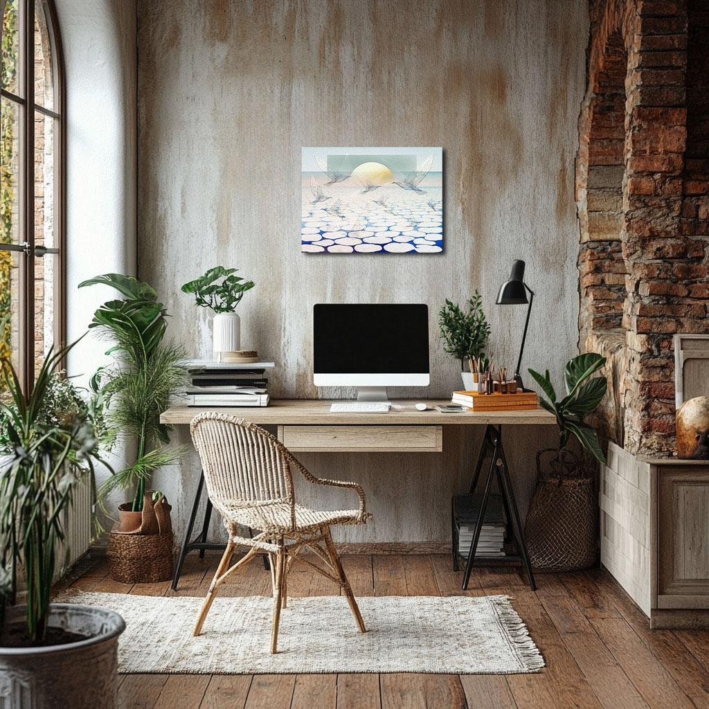 This reimagining of Georgia O’Keeffe’s Sky Above Clouds III blends her minimalist abstraction with contemporary geometric forms. Soft, undulating clouds stretch into the horizon, framing translucent wireframe birds that symbolize freedom and unity. The calming hues of white, blue, and yellow create a serene atmosphere, while the addition of structured elements reflects the balance between nature and human innovation. By integrating O’Keeffe’s timeless vision with modern interpretations, this piece celebrates the infinite beauty of the sky and invites introspection on our place within it.