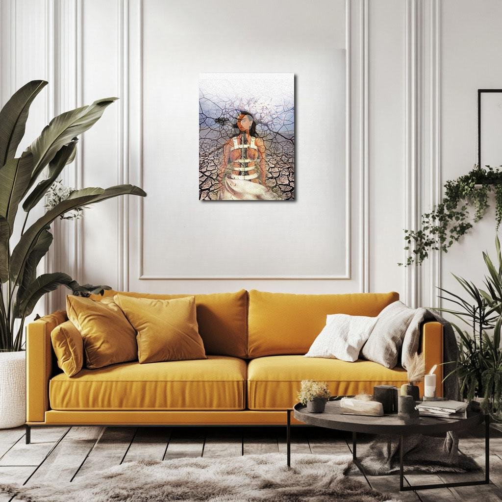 This conceptual reinterpretation of Frida Kahlo’s The Broken Column amplifies the emotional and symbolic depth of the original work. By merging Kahlo’s fractured body with the cracked, barren earth, the piece creates a unified vision of vulnerability and strength. The muted earth tones and stark whites evoke a profound sense of isolation and resilience, while the nails piercing her skin symbolize the unrelenting pain she endured. This artwork celebrates Kahlo’s legacy, offering a powerful reflection on her ability to transform personal suffering into a universal language of hope and endurance.