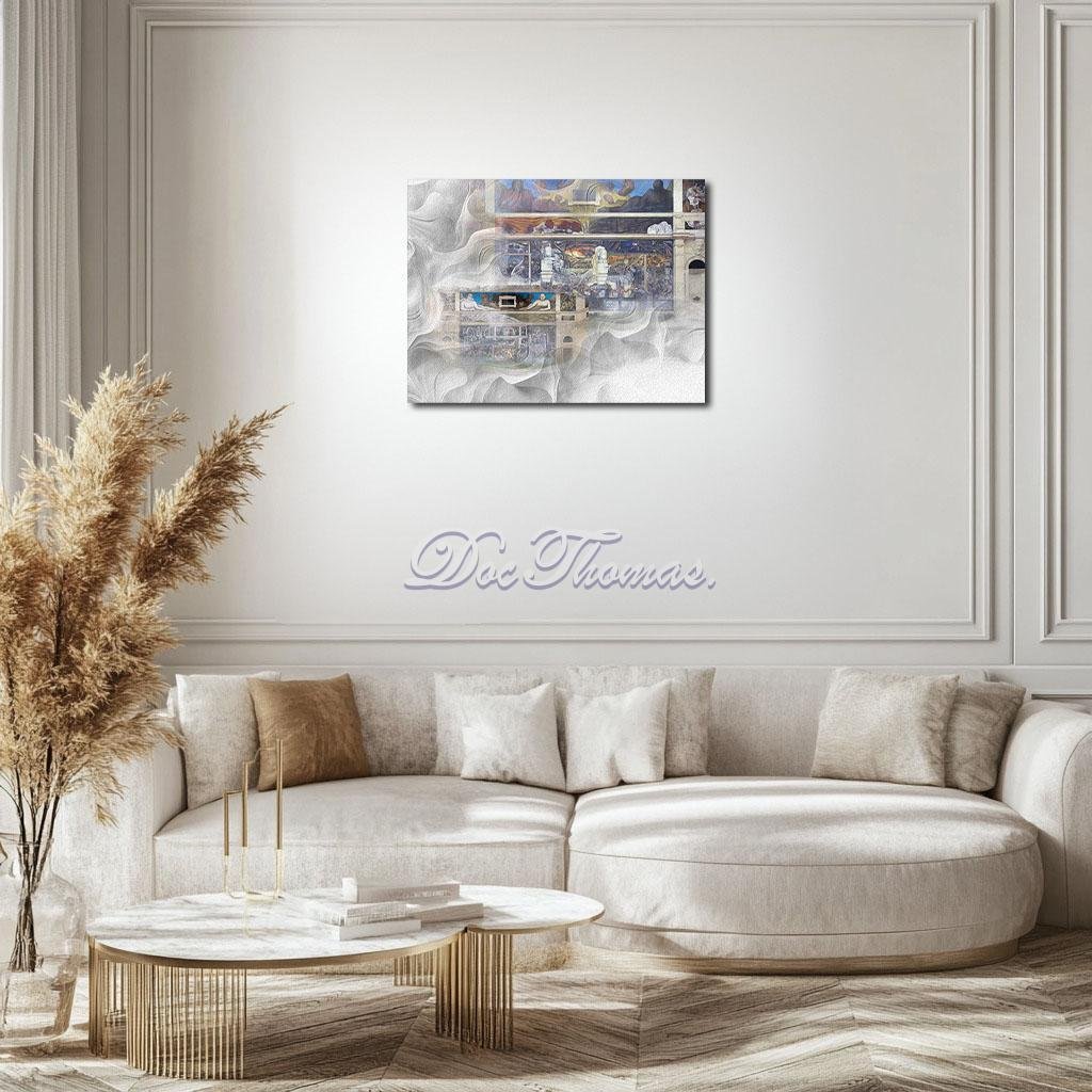 In this surreal reinterpretation, the murals are enveloped in a swirling fog, suggesting the complexities and uncertainties of industrialization. The addition of abstract white and gray hues evokes a sense of temporality, as if the viewer is witnessing the rise and fall of civilizations through the lens of Rivera’s artwork. These clouds, soft and flowing, contrast sharply with the geometric precision of the murals’ original components, underscoring the tension between humanity’s organic nature and the mechanized world it has built.
