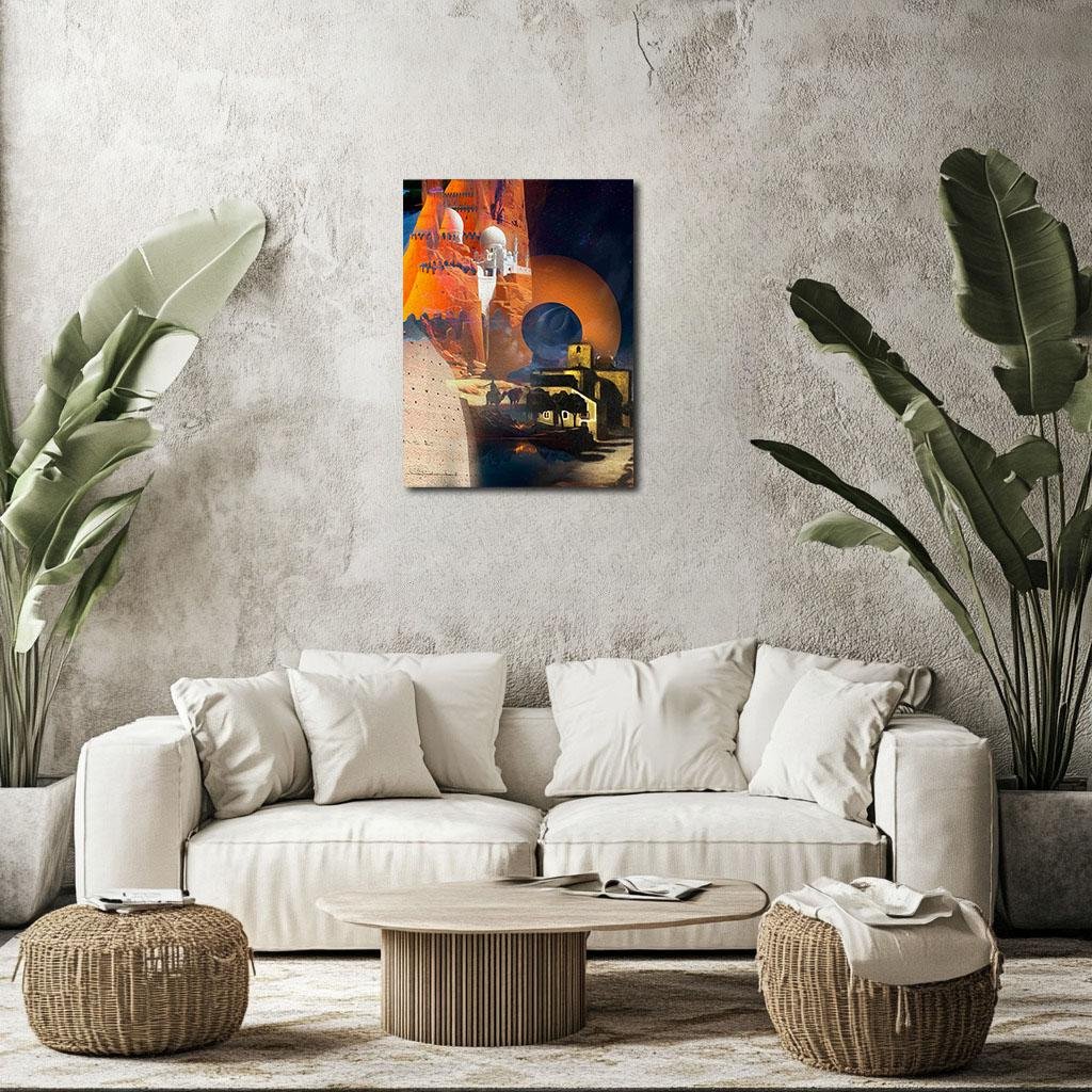 Oasis of Stars reimagines Diego Rivera’s Night Scene in Avila as a transcendent landscape where domed architecture meets galactic stillness. A glowing mosque rises from sunburnt cliffs into a dark sky ringed with planetary orbits, while a fortress in shadow reflects in a pool of stars. Warm saffron and orange hues blend with cosmic blues and silvers, balancing earth and cosmos, history and myth. Through surreal layering, this piece turns a Spanish town into a dreamlike portal—inviting the viewer to walk the line between memory, faith, and the infinite.