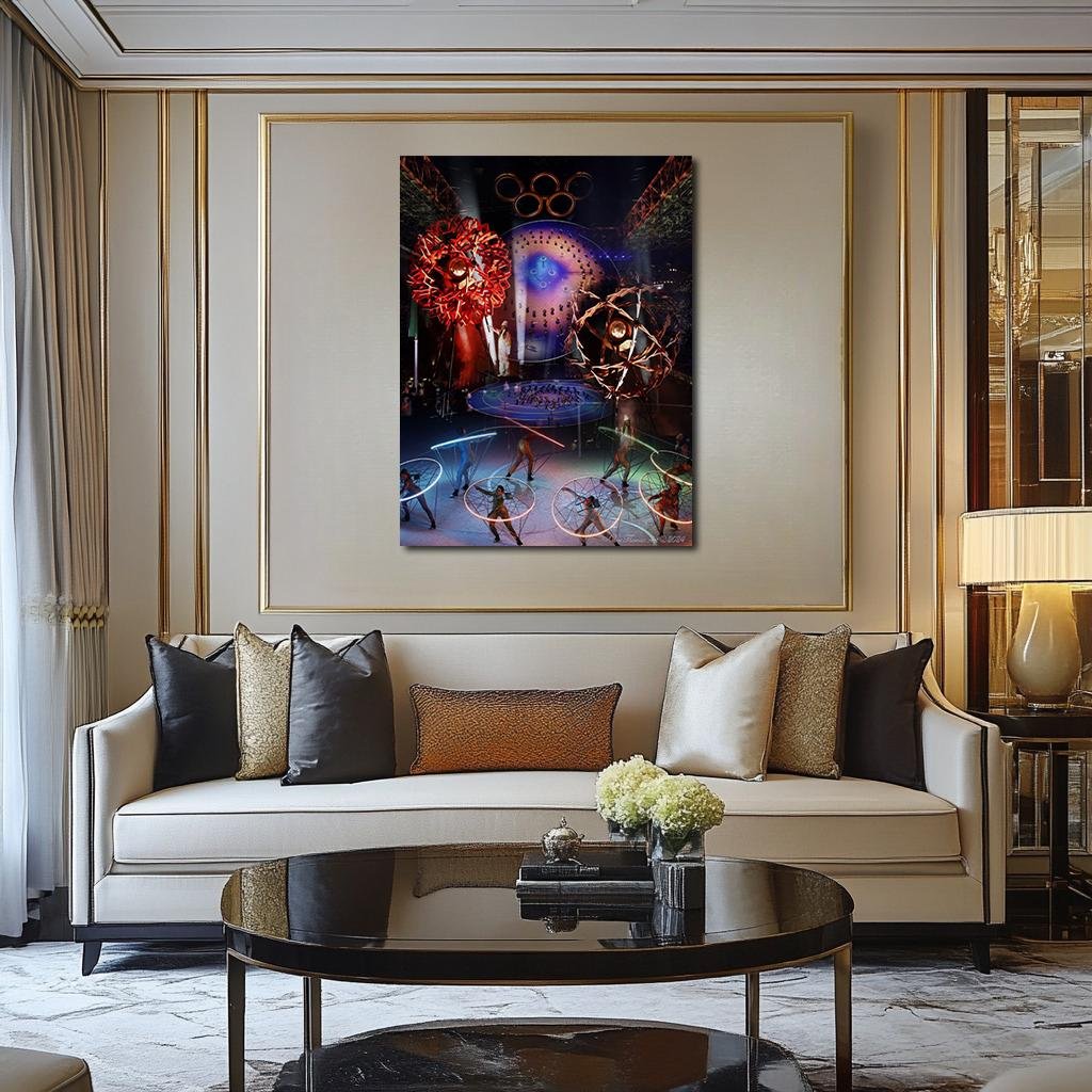 Emotionally, the artwork radiates controlled grandeur rather than sensory excess. Critics often noted the ceremony’s refined balance — spectacular yet disciplined — and this composition embodies that equilibrium. There is dynamism, yet also breathing room; innovation, yet reverence for tradition.