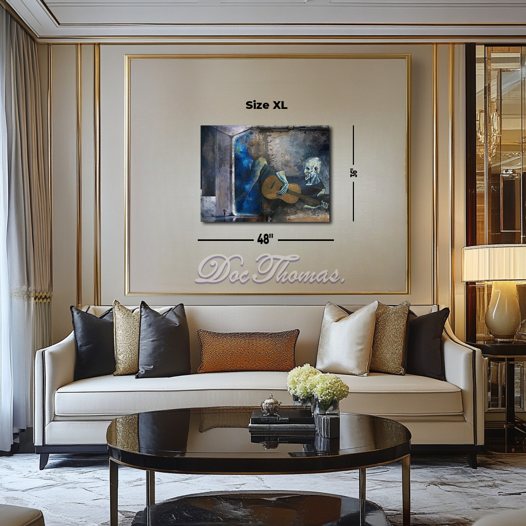As the artist behind this reinterpretation, my goal was to honor Picasso’s exploration of human suffering while expanding its narrative. I sought to portray the guitarist not as a solitary figure but as a universal symbol of humanity’s resilience and its eternal search for meaning. His music becomes a metaphor for the human spirit—a sound that persists, reverberates, and transcends even the harshest conditions.