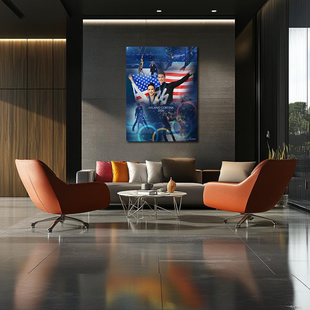 The work also acknowledges the broader context: Chock & Bates’ individual silver provoked discussion about judging margins and panel variance after the Free Dance; media coverage and the ISU’s public statements about judging safeguards make clear that, although five of nine judges scored the Americans higher than the French pair, a single wide margin from one judge shifted the arithmetic enough to change the gold/silver ordering — a controversial microhistory that the painting renders as a barely perceptible, but telling, variance in tone along the upper right edge. This gap — aesthetic, numerical, human — is part of the Olympic narrative in 2026.