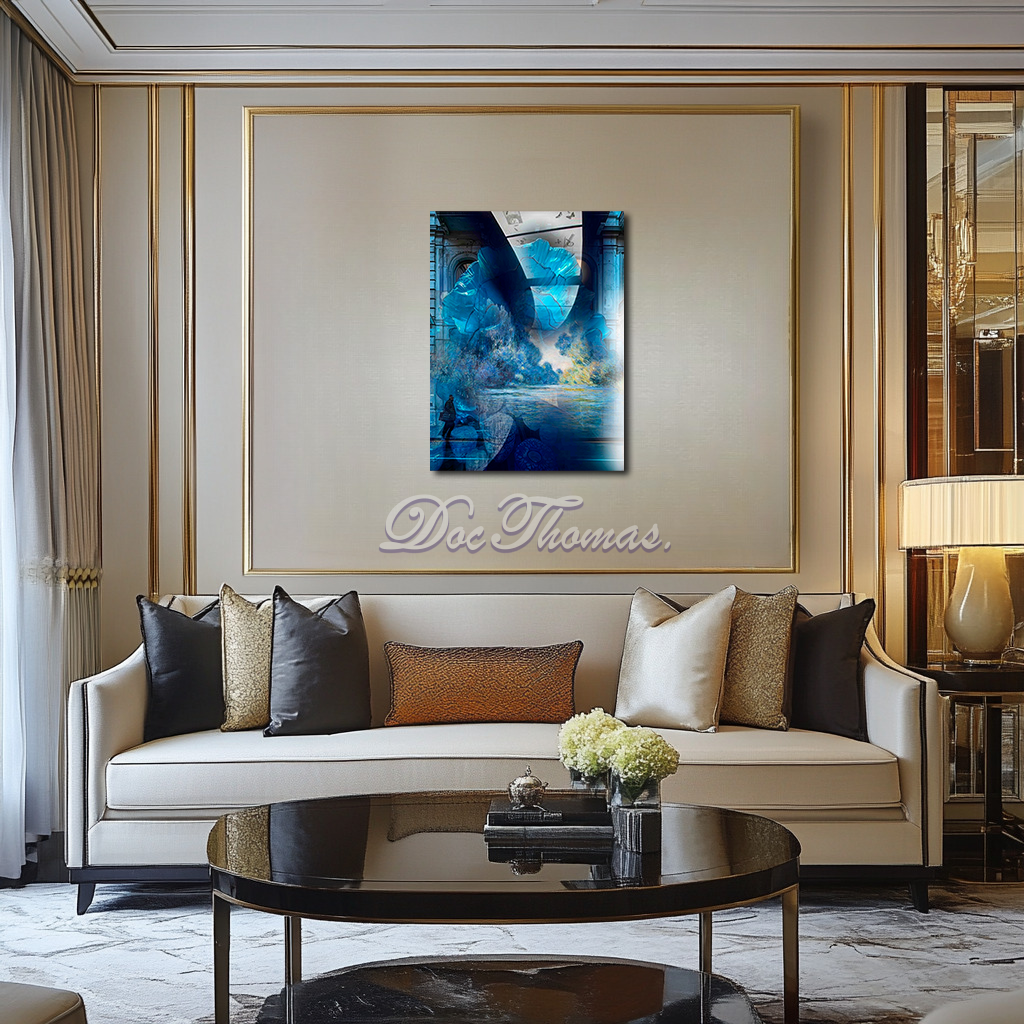 The dominant shades of blue in this piece symbolize mystery, introspection, and the fluid passage of time. Monet’s fascination with light and water is preserved but altered, as the scene now takes on an ethereal, almost crystalline texture. The soft reflections of trees on the water, characteristic of Monet’s original impressionist strokes, merge with contemporary geometric fragments, creating a sense of motion and transformation.