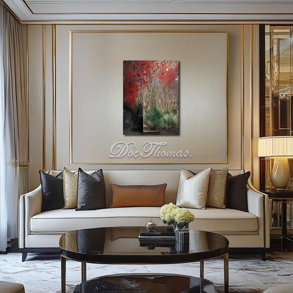 The choice of color plays a critical role in conveying the work’s emotional and symbolic undertones. The verdant greens of the plants represent life, growth, and renewal, echoing the themes of the original painting. The bold reds in the background, often associated with passion, energy, and danger, create a dramatic contrast that underscores the tension between nature’s enduring vitality and its vulnerability in the face of external forces. The gray and black tones evoke shadows and decay, reminding viewers of the cyclical nature of life and death.