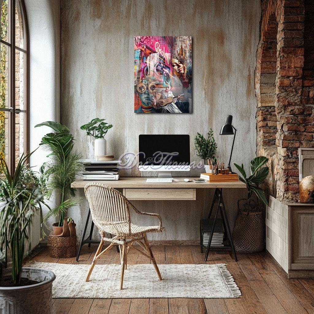 Vermeer’s original subject—a woman lost in the melody of her own creation—becomes the center of a storm spun by decades of musical upheaval. Behind her rise monumental boomboxes, graffiti-tagged walls, and collaged cassette decks that evoke the tactile resistance of past soundscapes. Vinyl, mixtapes, and neon signs are not accessories in this reinterpretation—they are memory triggers, relics of a different rebellion, a pulsing heartbeat of a generation that translated life through basslines and breakbeats. The strings of her baroque guitar dissolve into the wires and circuits of modern amplification, making her music echo across centuries.