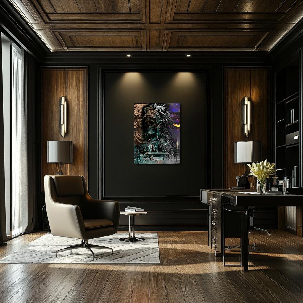 To the left, the soft contour of an Aztec or Mayan stone sculpture looms, chiseled in warm sandstone and wrapped in shadows. It gazes forward, its lips frozen mid-chant. A reminder of ancestry—unmoved, but watching. On the right, the black feathered plume of death rises like a storm, encasing the composition in nocturnal force. The skeletal god that emerges from this mass is rendered in shades of blue-green, serpentine and regal, holding in its sockets both mourning and inheritance.