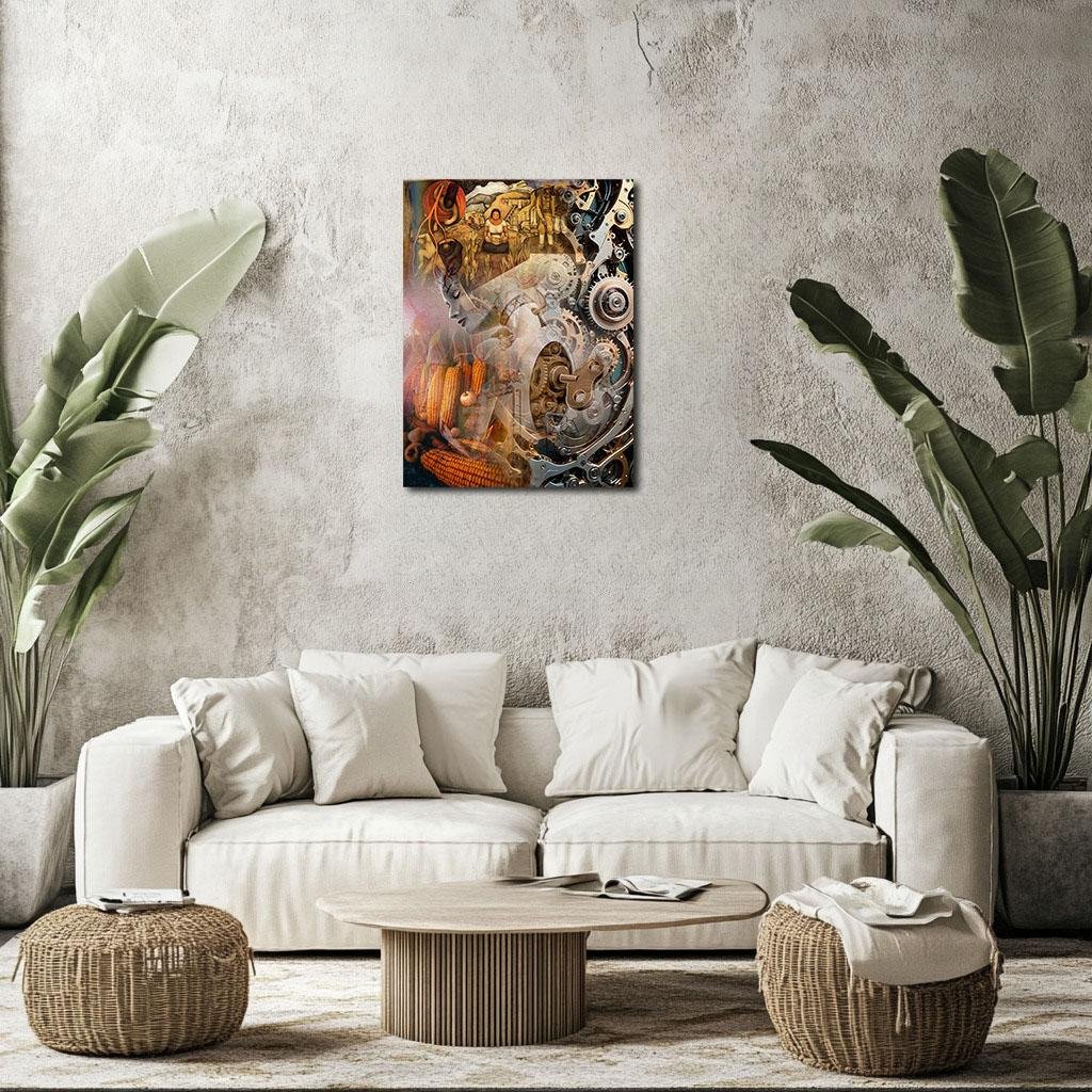 The Clockwork Field reimagines Diego Rivera’s Mechanization of the Countryside as a symbolic fusion of rural tradition and mechanical evolution. Golden maize and stoic farmers melt into gears and cogs, where color shifts from earthen warmth to industrial silver. A woman’s form embodies this metamorphosis—half soil, half steel. Through surreal abstraction and metallic tension, this piece mourns the fading rituals of the land, transforming Rivera’s agrarian reverence into a meditation on memory, machinery, and the mechanized pulse of progress.