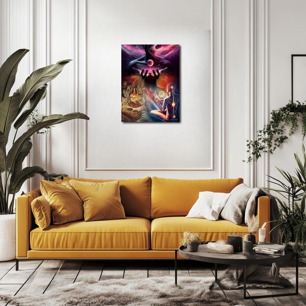 The Cosmic Cradle reimagines Frida Kahlo’s The Love Embrace of the Universe as a transcendent spiral of maternal earth, inner light, and celestial unity. Through radiant violets, golden browns, cosmic pinks, and stone-carved skin, Frida, Diego, and the Earth deity dissolve into a sacred continuum. Above them, a divine figure holds a glowing planet in outstretched hands, while a meditating soul glows in radiant stillness. This work is not about connection—it is connection, a dream of the body as cosmos, of Kahlo as the pulse between breath and stars.