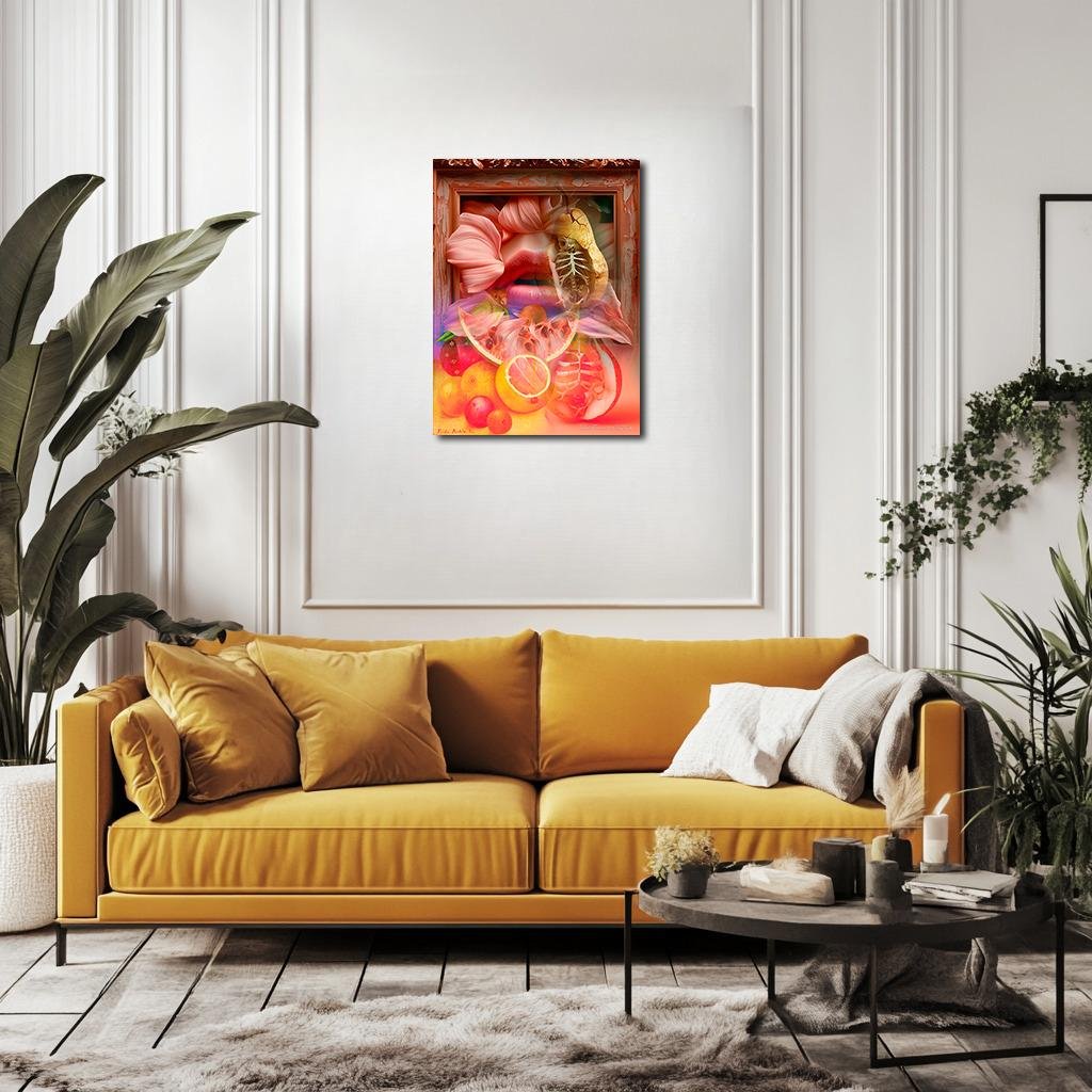 When I created The Flesh of Memory , I sought to uncover the beating intimacy hidden inside Frida Kahlo’s quietest works. Her still lifes are often overlooked—yet they are profound meditations on what remains, what ripens, what is consumed, and what must be let go. In this reimagining, the fruit is no longer passive. It is sensuous, anatomical, sacred. The parakeet of the original painting has vanished in form but is echoed in the curves of the petals and the whisper of pink against the frame—its voice transformed into mood, its chirp into perfume.