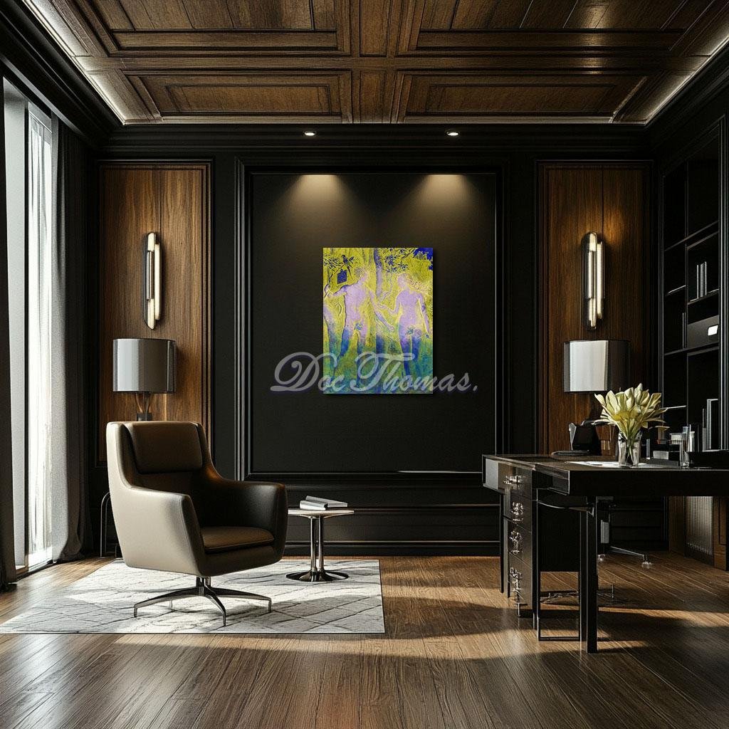 In this pop art reinterpretation, the addition of bold, saturated colors transforms the work’s emotional resonance. Yellow, associated with enlightenment and vitality, dominates the composition, infusing the scene with an intense, almost otherworldly energy. Blue, often linked to depth, wisdom, and introspection, tempers the vibrancy of yellow, creating a dynamic contrast that mirrors the tension between innocence and temptation. Purple, a color of spirituality and transformation, underscores the profound consequences of Adam and Eve’s actions. Together, these colors evoke a visceral response, inviting viewers to engage with the artwork on an emotional as well as intellectual level.