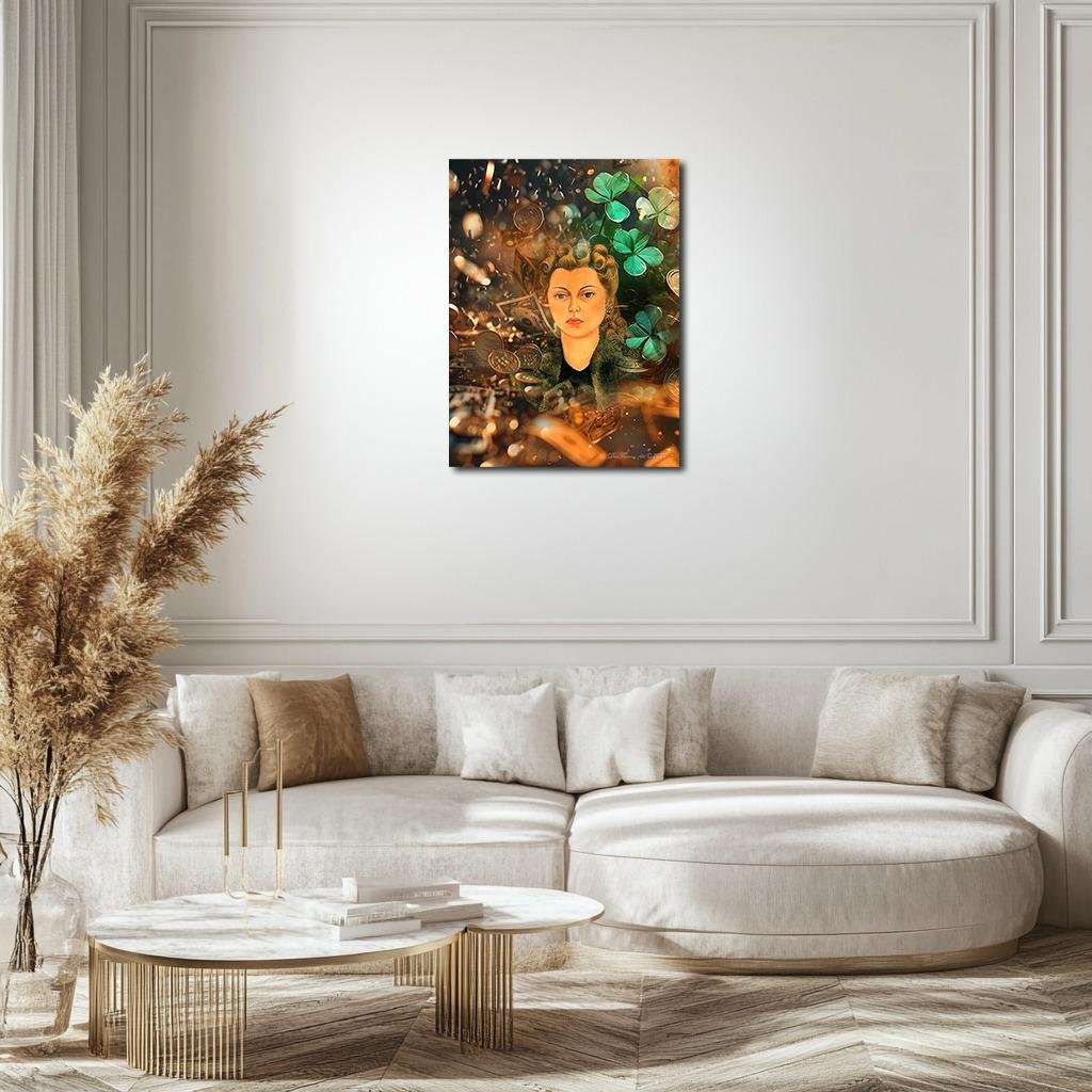 This conceptual reimagining of Frida Kahlo’s Portrait of Mrs. Natasha Gelman recasts the poised elegance of wealth into a lush, surreal meditation on transience, longing, and the fragile roots of abundance. Titled The Silent Bloom of Fortune , the piece transforms Gelman’s composed figure into a luminous anchor amidst a cascade of gold, currency, and clover—symbols of prosperity and ephemeral luck swirling beyond control.