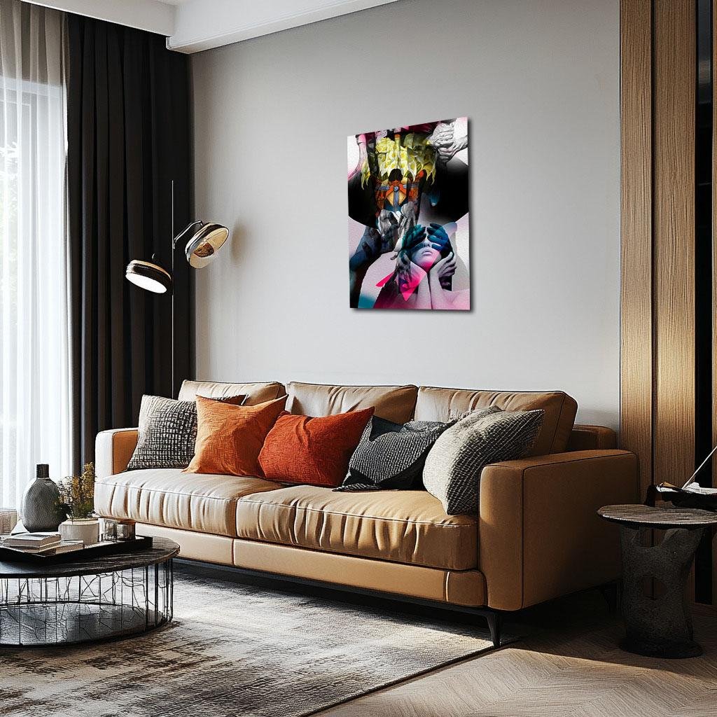 Behind and beneath the flower cluster, the entire canvas splits into ghostly dualities. On the lower half, a contemporary figure—stylized, ethereal, emotionally raw—emerges in fragments. Her face is half-lit, half-concealed, the hands over her eyes painted in streaks of neon pink and cyan. This contrast of modern hues against Rivera’s earth tones is jarring and intentional. Her posture mirrors the vendor’s: head bowed, enclosed. But where Rivera’s subject is weighed down by flowers, this woman is weighed down by perception itself—the layered hands suggest anxiety, censorship, overstimulation, even identity distortion in the digital age.