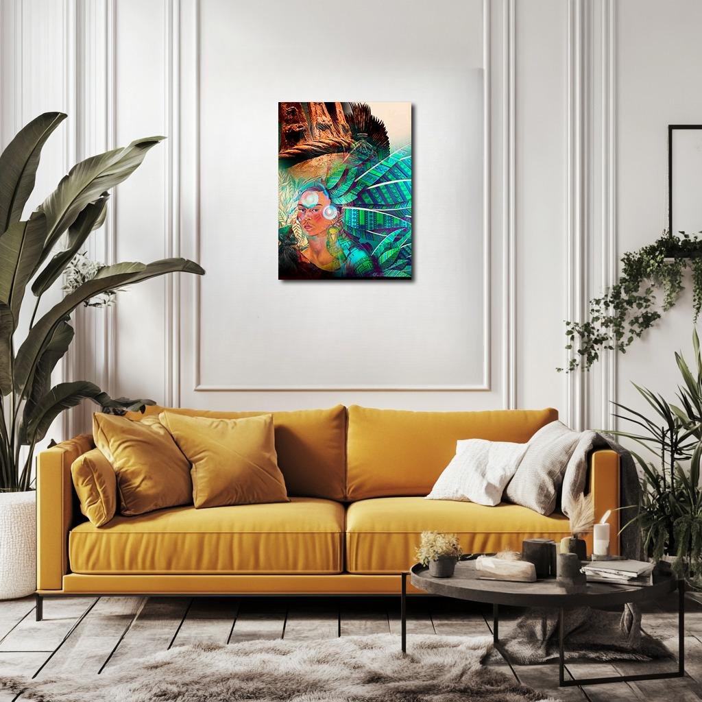 The Spirit of Plumes reimagines Frida Kahlo’s Self-Portrait with Monkey and Parakeet as a mythic vision of ancestral strength and sacred identity. Through warm ochres, glowing teals, emerald feathers, and shadowed animal totems, Kahlo stands crowned in ceremonial splendor—both warrior and channel. Surrounded by symbols of ancient Mexico and divine geometry, the piece honors Frida as not merely an artist of pain, but a bearer of sacred continuity, forever adorned in the memory of earth and spirit.