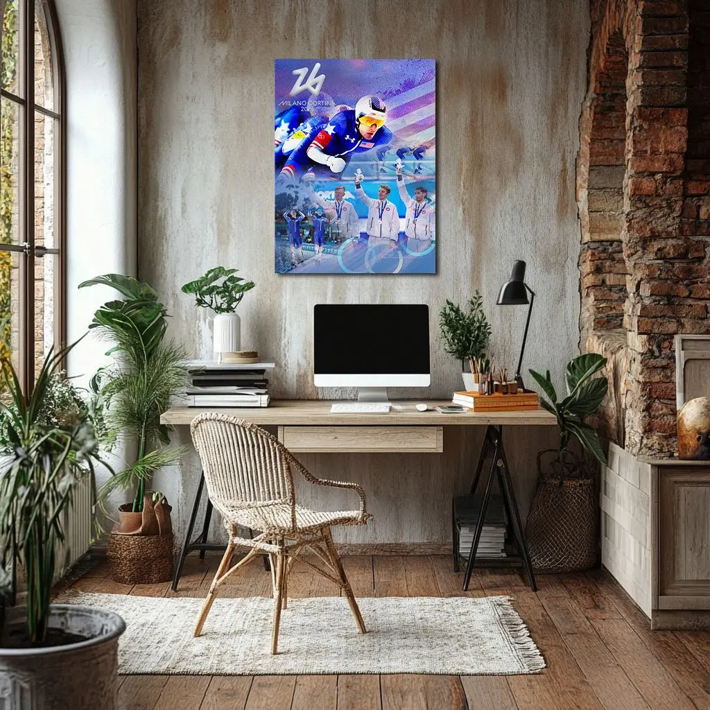 At the Milano Cortina 2026 Olympic Games, Ethan Cepuran, Casey Dawson, and Emery Lehman captured Silver in the Men’s Team Pursuit, completing 3,200 meters over eight laps with official timing recorded to 0.01 seconds. The race required precise rotational exchanges, aerodynamic drafting within 0.5 meters, and sustained lap splits averaging roughly 26–28 seconds. With the team’s time determined by the third skater crossing the line, synchronization was decisive. Rendered in sapphire arcs symbolizing oval curvature and cool silver illumination reflecting collective precision, the artwork transforms eight laps of measured velocity into enduring Olympic unity.