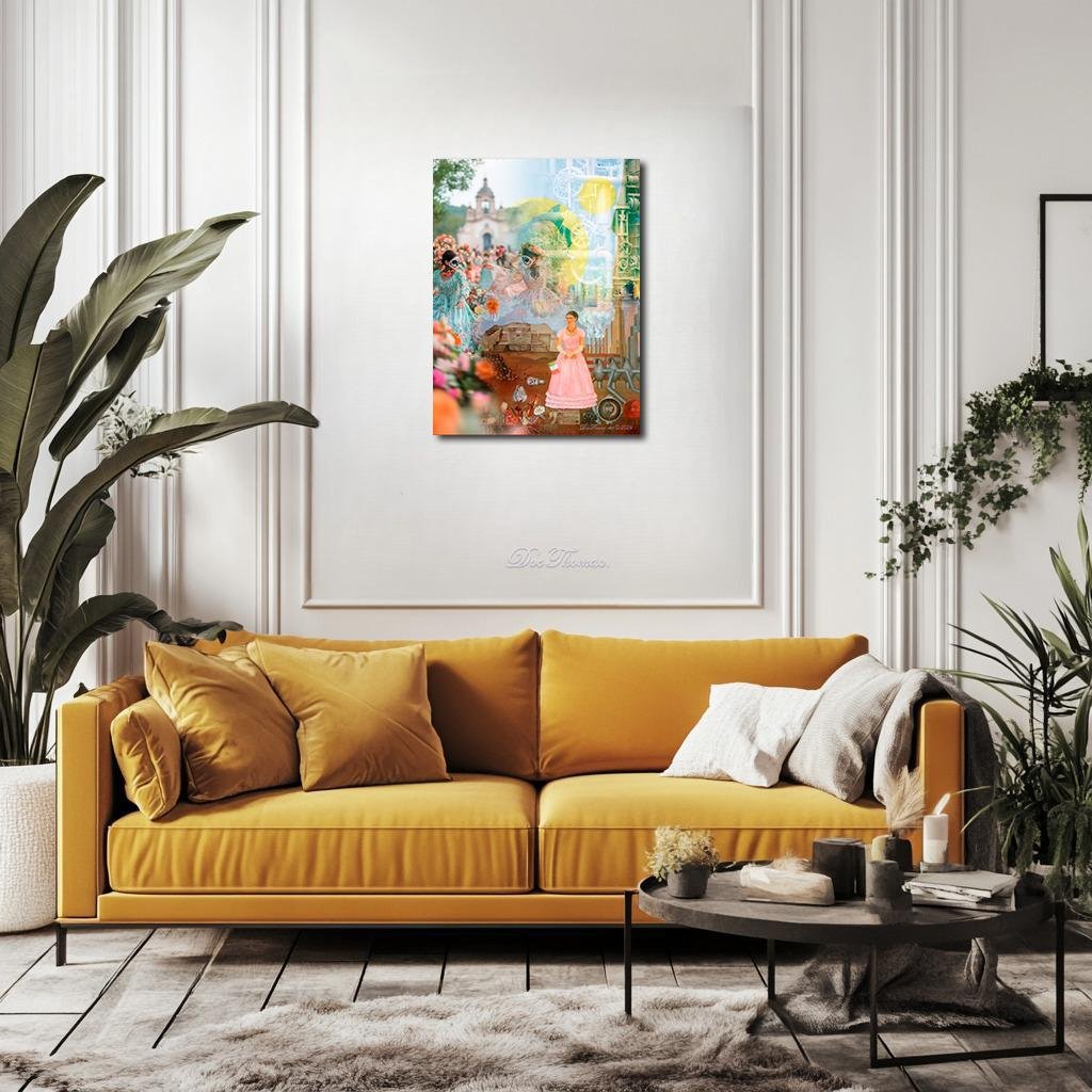 Threshold of Two Worlds reimagines Frida Kahlo’s Self-Portrait on the Borderline Between Mexico and the United States as a vibrant, surreal collision of ancestral ritual and mechanical modernity. Through rich siennas, tangerine blooms, icy teals, and digitized golds, Kahlo’s figure bridges life and machine, memory and exile. Surrounded by dancing skeletons and silent steel, she stands as a sovereign body between clashing realities, rooted not in one nation, but in the unshakable truth of her own becoming.
