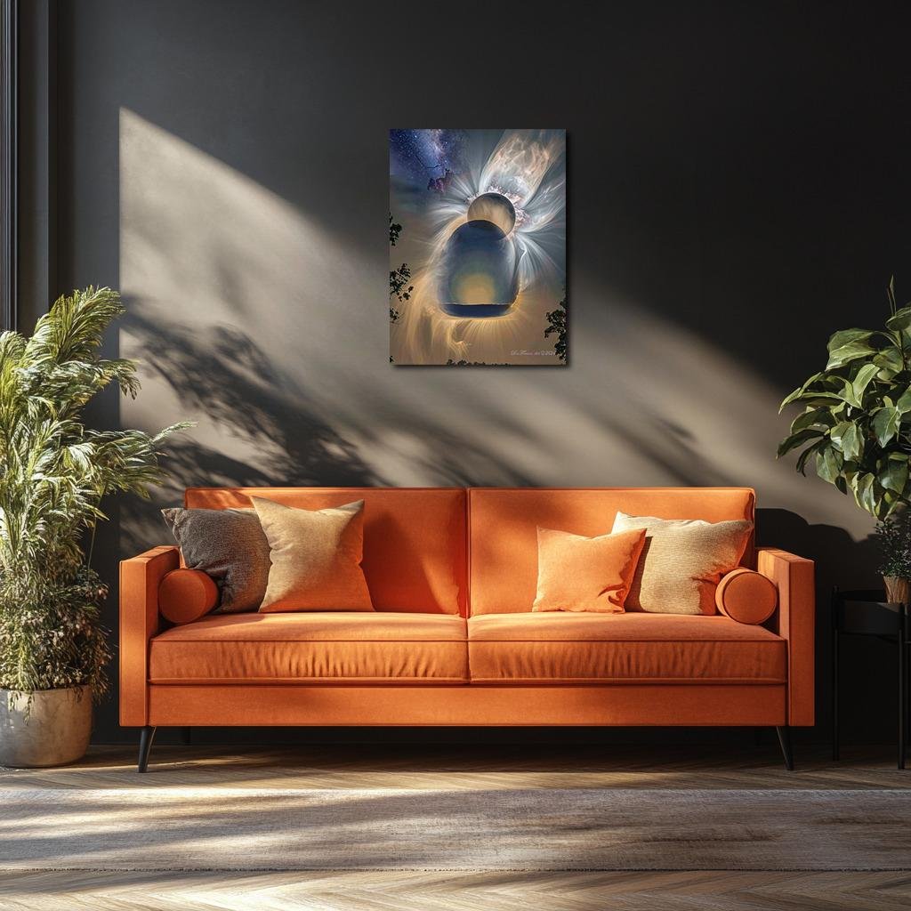 Veil of Dawn , a conceptual reimagination of Georgia O’Keeffe’s Light Coming on the Plains , carries the minimalist spirit of her original work into a realm of celestial awakening and cosmic symbolism. The composition retains the essence of O’Keeffe’s vision—a solitary shape, soft and abstracted, against the early light—but expands the metaphor into a meditation on planetary emergence, cosmic rebirth, and the silent power of becoming. Her iconic semi-abstract form, once nestled in the stillness of an American dawn, is now suspended within an unfolding stellar eclipse, casting an otherworldly glow that stretches the meaning of “light” into something mythic.