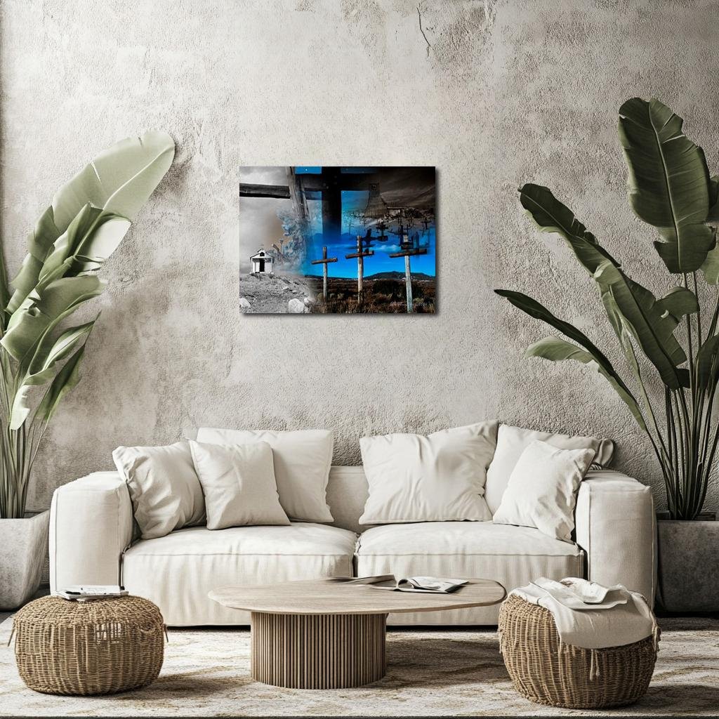 At the center, three dominant crosses rise out of a dry, gold-tinged brushland—weathered wood scarred by sun and time. Their stark verticality draws the eye upward, cutting into a sky that transitions from surreal blue into spectral black. These crosses do not simply mark a location—they mark memory, mourning, and the haunting persistence of belief. Behind them, O’Keeffe’s original adobe chapel and sky are split open—half fading into grayscale memory, the other projecting a surreal, dreamlike reflection of ghost towns, burial grounds, and distant mountains. This duality is central: life and afterlife, landscape and symbol, seen and unseen.