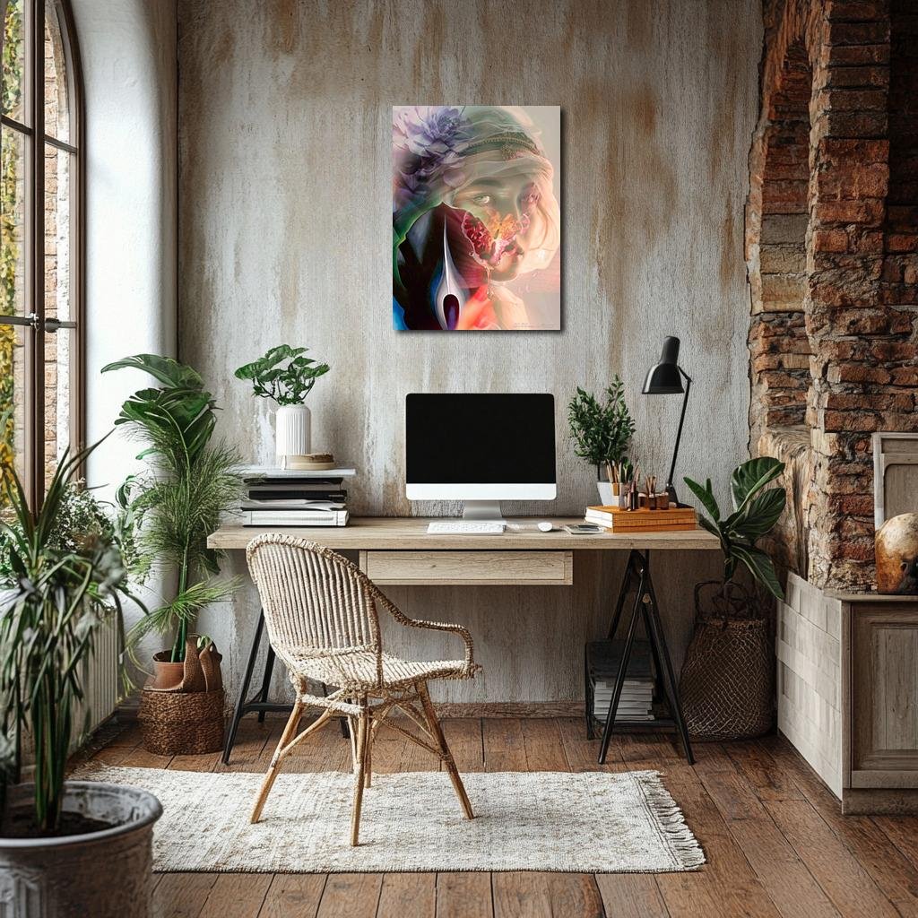 Veil of the Pulpit reimagines O’Keeffe’s Jack-in-the-Pulpit No. IV as a sensual, symbolic portrait of veiled identity and inner voice. A delicate blossom flows into the face of a woman wrapped in translucent fabric, where petals become lips and silence becomes bloom. Saturated in rich emeralds, purples, and deep floral pinks, the image explores femininity as sacred space—both hidden and powerful. O’Keeffe’s flower transforms into a metaphor for language, desire, and emotional truth, becoming less a botanical study and more a living altar of voice, beauty, and the unseen spirit of blooming selfhood.