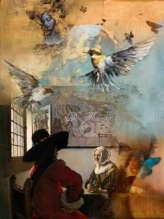 As the artist, my thought while reimagining Officer and Laughing Girl was rooted in the paradox of stillness and motion. I saw the original work as a conversation not just between two people, but between presence and absence, interior and exterior, moment and echo. I wanted to retain the gentle light that Vermeer so lovingly gave to the girl, but to expand it into a metaphysical glow—a symbol of laughter as liberation. Her joy, though bound by four walls and societal constraint, felt too expansive to stay confined. So I imagined it taking flight—transformed into birds, dreams, and breath against time-stained cartography.