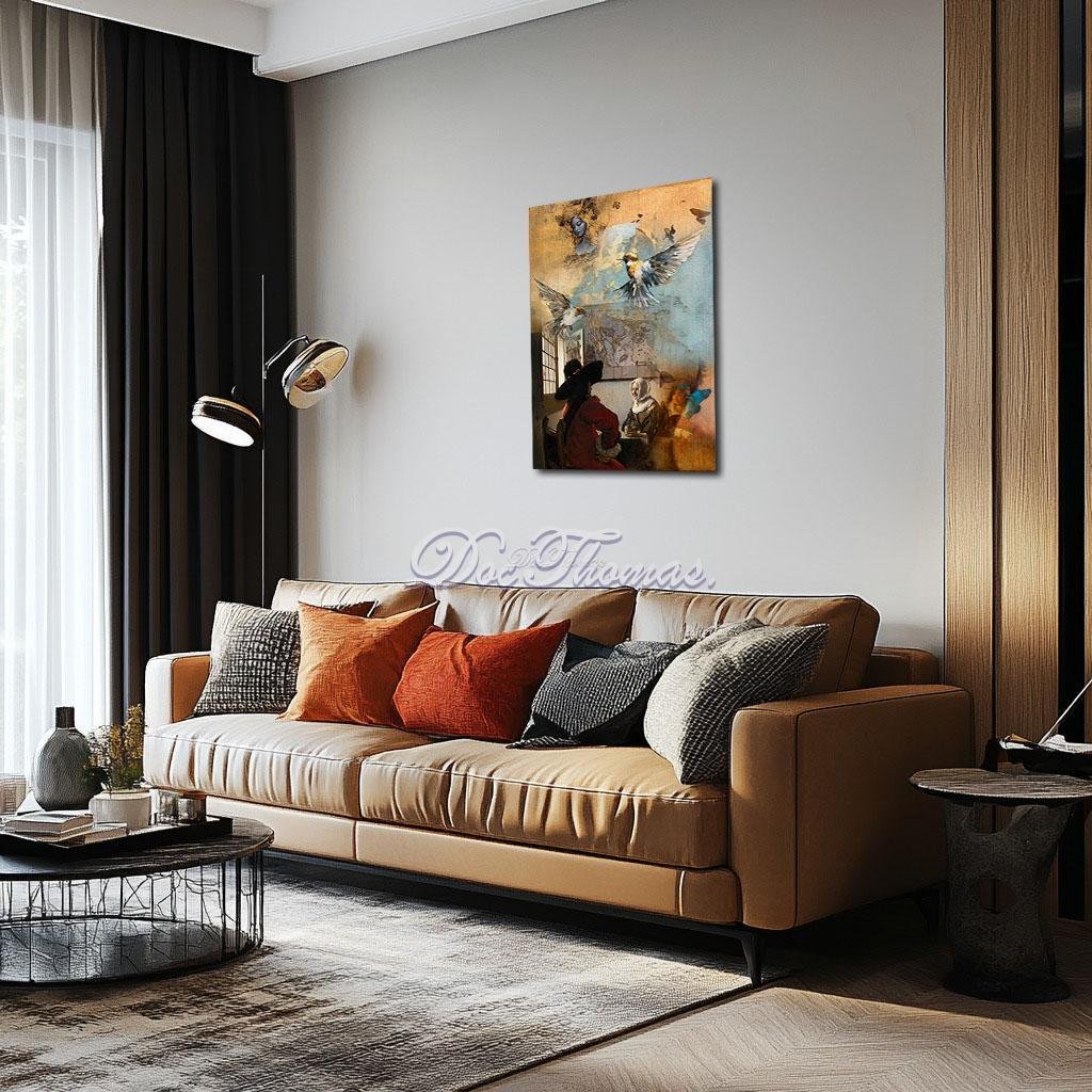 Vermeer’s original composition placed the woman near the light-filled window, her face illuminated by natural light, the officer cloaked in shadow—his back to the viewer, his identity partly obscured. In this surreal reinterpretation, their interaction is reframed through a dreamscape that overlays the walls, furniture, and air itself with translucent symbolism. The setting still whispers of Delft, yet the world that envelops the figures drifts far beyond 17th-century Netherlands.