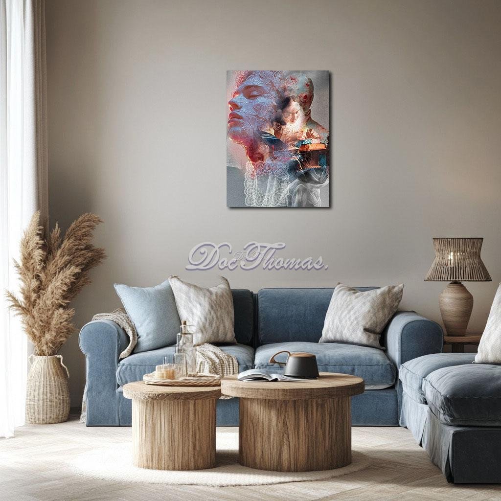 Veins of Porcelain: Needlework Beneath the Breath reimagines Johannes Vermeer’s The Lacemaker as a deeply layered meditation on feminine ritual, memory, and lineage. The lacemaker, still poised in concentration, is now wrapped in swirling lace and the ghostly presence of another feminine figure—eyes closed, face tilted in breath. The composition merges flesh with fabric, creating a dreamspace where color and texture speak louder than language. Soft pinks and dusted reds suggest warmth and generational memory; blues swirl in aquatic silence;