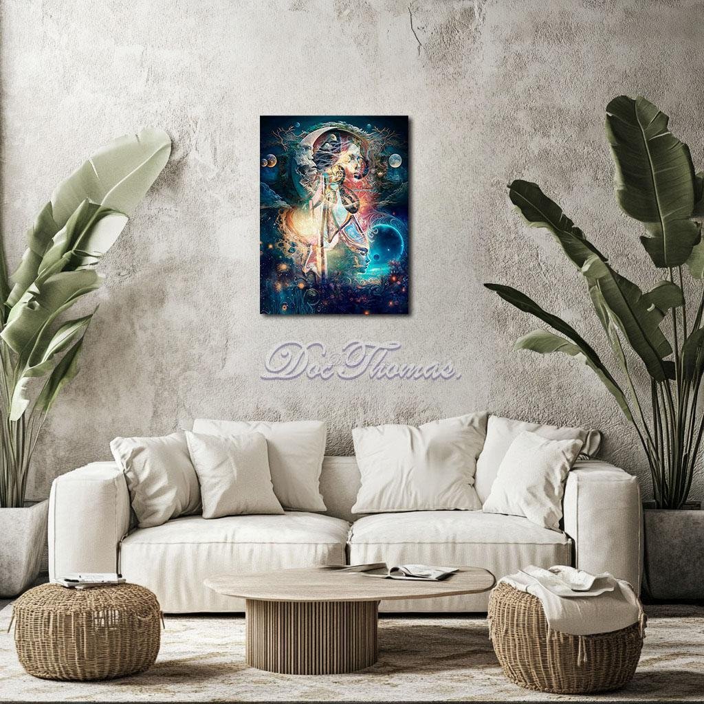 As an artist, my thoughts while creating this circled the eternal dance between creation and dissolution—the way the feminine energy, in all its quiet vastness, holds the mysteries of both life and inevitable death. In Pollock’s The Moon Woman , we glimpse the raw essence of these forces. Here, that essence becomes a living galaxy—each breath of the Moon Woman sending ripples through the constellations, each closed eye holding the weight of dreams vast enough to swallow stars.