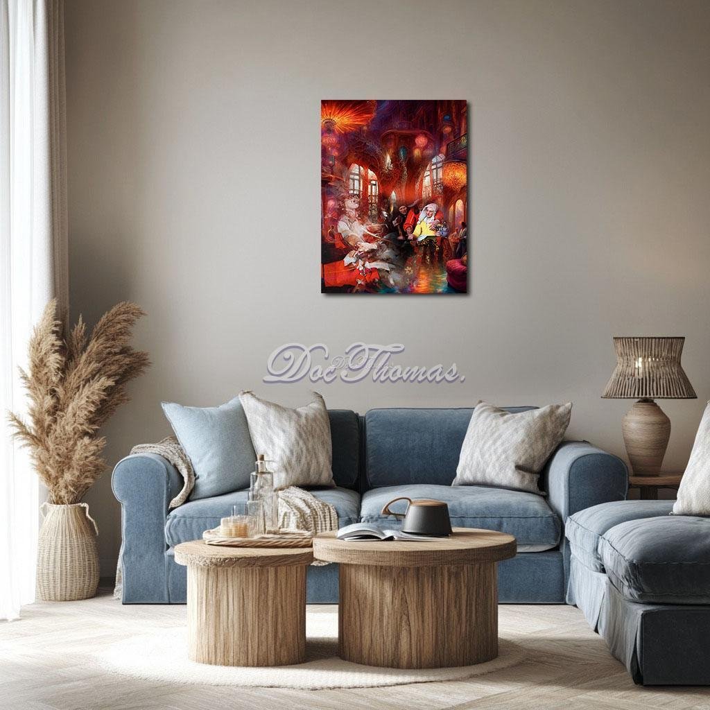 As the artist, my intent in reimagining The Procuress was to illuminate the seductive systems of economy that frame desire—not merely as the exchange of coin for company, but as the ambient architecture that cloaks the transaction in warmth, comfort, and moral ambiguity. The red is not simply sensual—it is a warning, a camouflage. Crimson speaks of power and danger, of bloodlines and betrayals. Burnt orange in the chandeliers suggests both celebration and captivity—a warm embrace that hides a lock. Golds streak across the garments like wealth too bright to question, too warm to resist. The woman’s yellow jacket, once symbolic of cheerful femininity, here glows with unsettling intensity—a beacon and a brand all at once. Her white lace collar gleams not in innocence but in fluorescent contrast, the only clean punctuation in an otherwise blurred exchange.