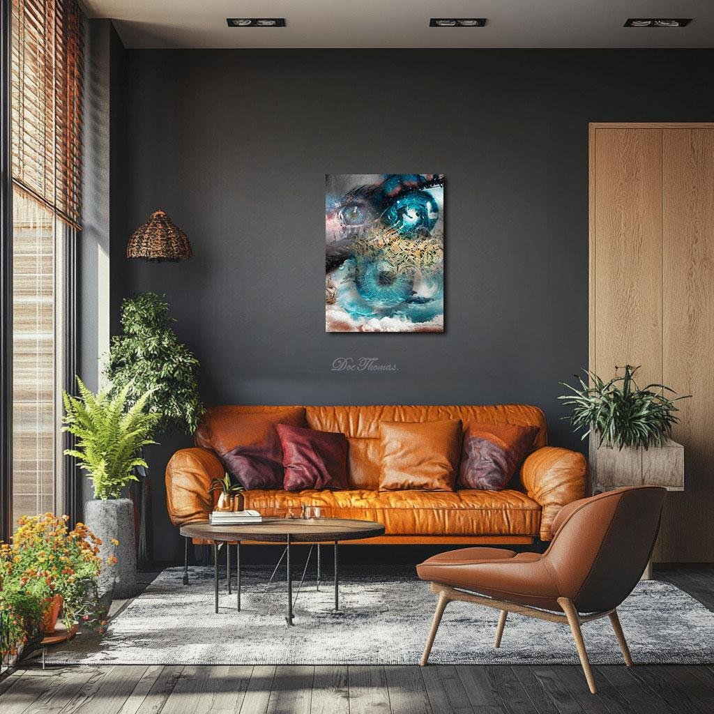 The color palette is a symphony of elemental tension. Icy ceruleans and deep midnight blues dominate the eye’s surface, evoking the cold clarity of realization and the endless depth of the unconscious. Amber flames flicker through Pollock’s chaotic patterns, symbols of thought burning bright before being extinguished by the rushing tide. Soft silvers and starlit whites dissolve into the outer edges of the composition, their fragile luminance the last flickers of a dying dream before the inevitable plunge into darkness.