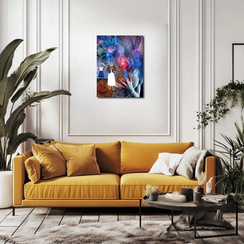 Vessels of Absence reimagines Frida Kahlo’s Memory, the Heart as a living landscape where grief blooms into electric flowers and thorned cacti. Saturated with arterial reds, electric blues, bruised violets, and spectral silvers, the piece weaves a dreamscape where the heart’s wounds pulse across body and sky. Through vivid fractures and surreal vitality, it honors Kahlo’s fierce endurance—the quiet, unbreakable rhythm of a spirit that turns absence into art.