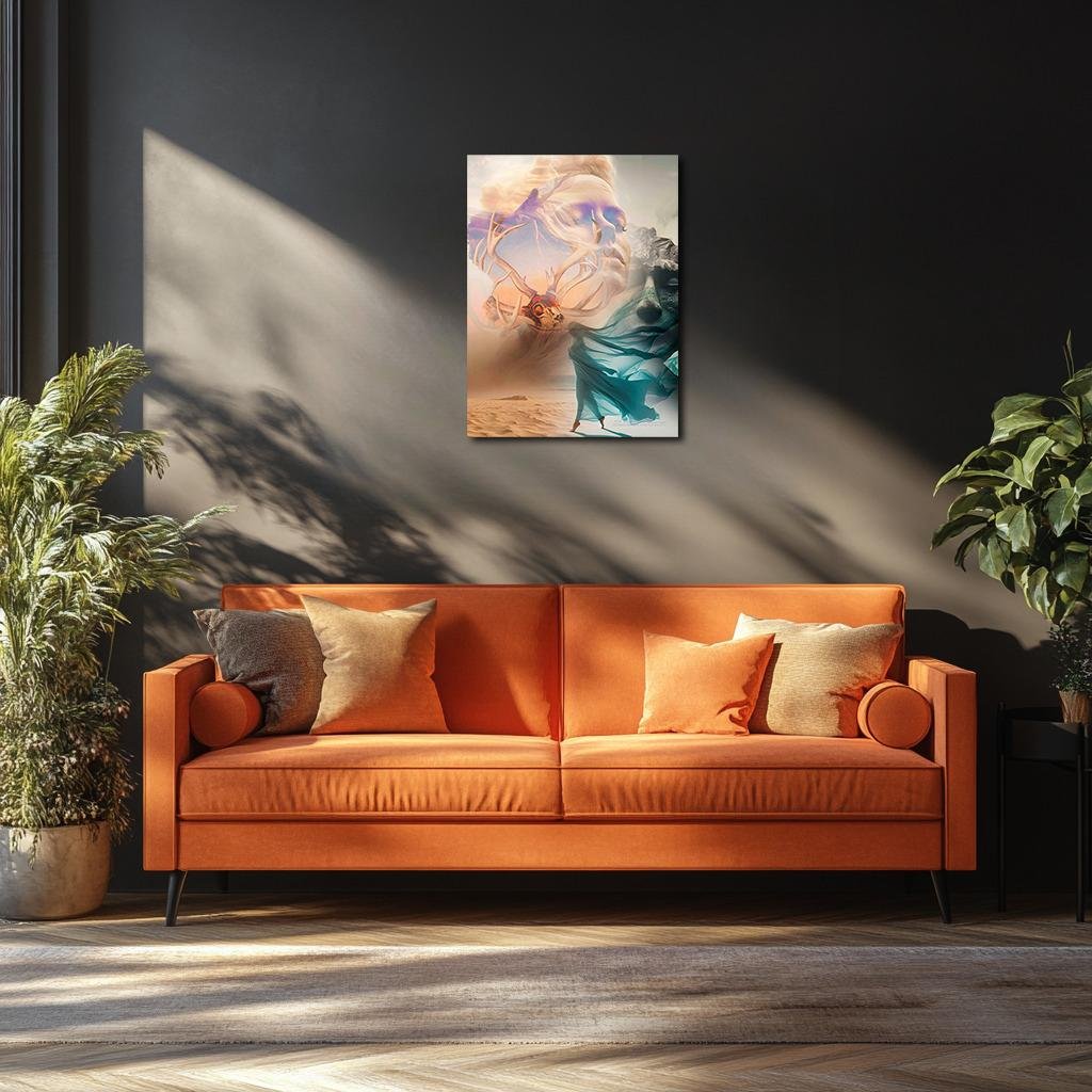 At the spiritual core of the composition lies the majestic antlered skull, now blended with a sleeping visage. The antlers reach like neurons through a dusty sky, their shape suggesting both growth and entanglement, an impossible symmetry of survival and surrender. The horns, tinged in ghostly ivory and burnt sienna, glow against a peach-washed atmosphere. Their hue radiates remembrance and resilience, symbolic of life’s bones exposed to beauty and time. The skull is no longer a trophy or totem; it has fused with consciousness, speaking of ancestral echoes and lost knowledge carried through blood and silence.