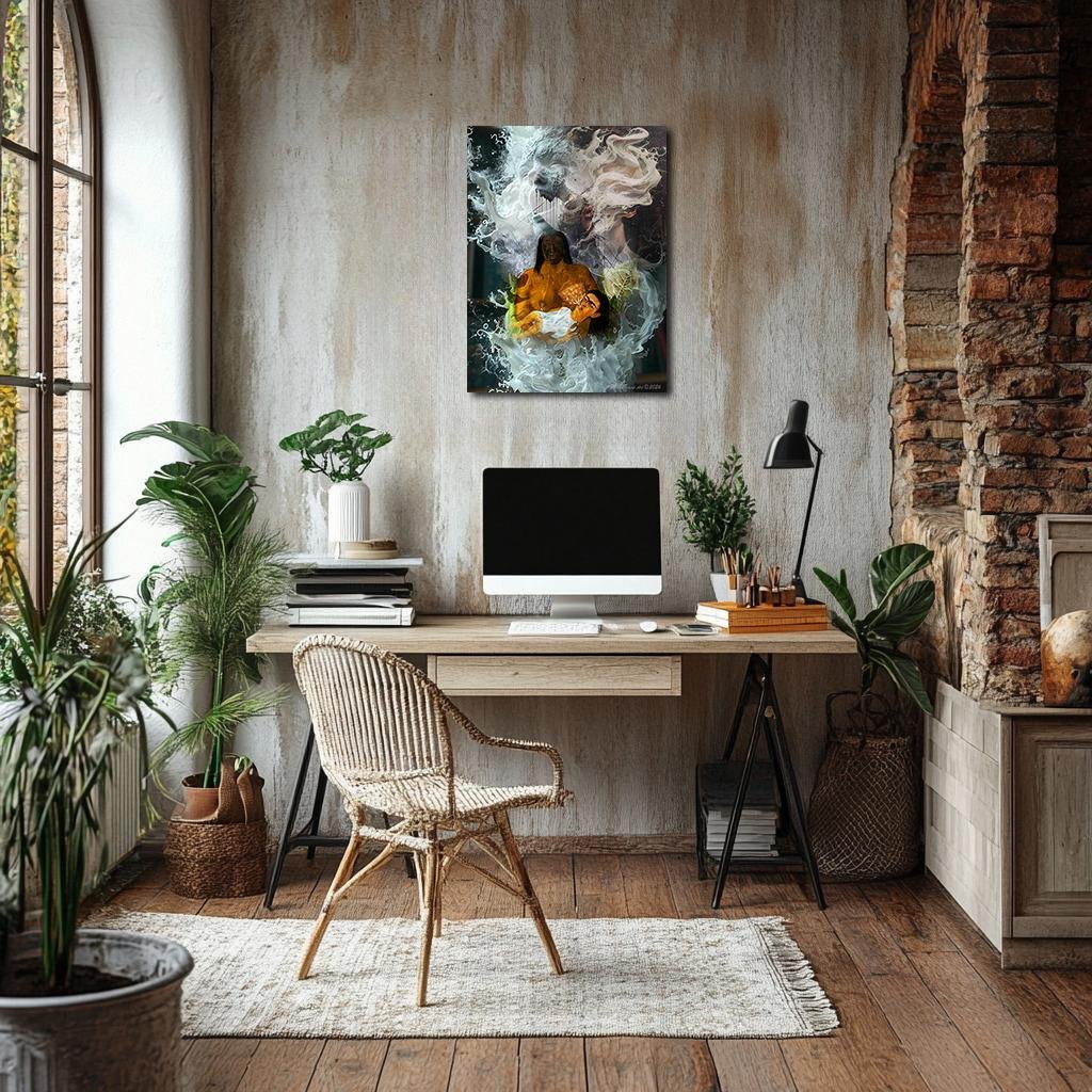Breath Between Bodies reimagines Frida Kahlo’s My Nanny and I as a mist-wrapped landscape where survival, absence, and silent inheritance flow through flesh and spirit. Anchored by earthy ochres, ghostly whites, bruised violets, and muted greens, the piece conjures a world where fractured bonds pulse through every breath. Through swirling mists and heavy embraces, it honors Kahlo’s fierce acknowledgment of both the life given and the love withheld—and the silent strength that blooms between them.