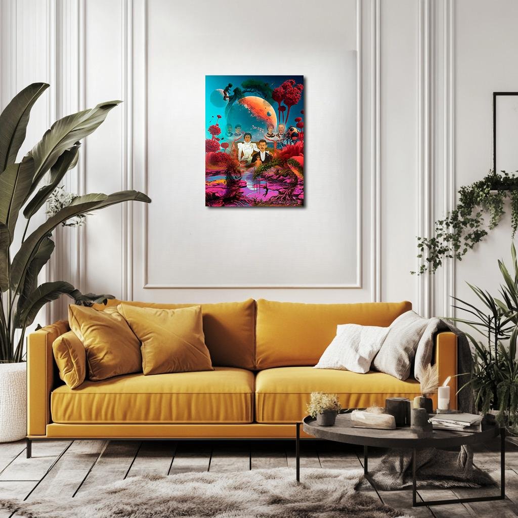 Constellations of Blood reimagines Frida Kahlo’s Family Tree as a surreal galactic vision where ancestry becomes a living nebula. Anchored by formal portraits of her family, the scene spirals into feverish pink forests, crimson planets, and electric blue skies. Through molten magentas, bruised purples, and spectral greens, the piece reveals lineage as both gravity and flight—a cosmic dance of memory, identity, and endless becoming.