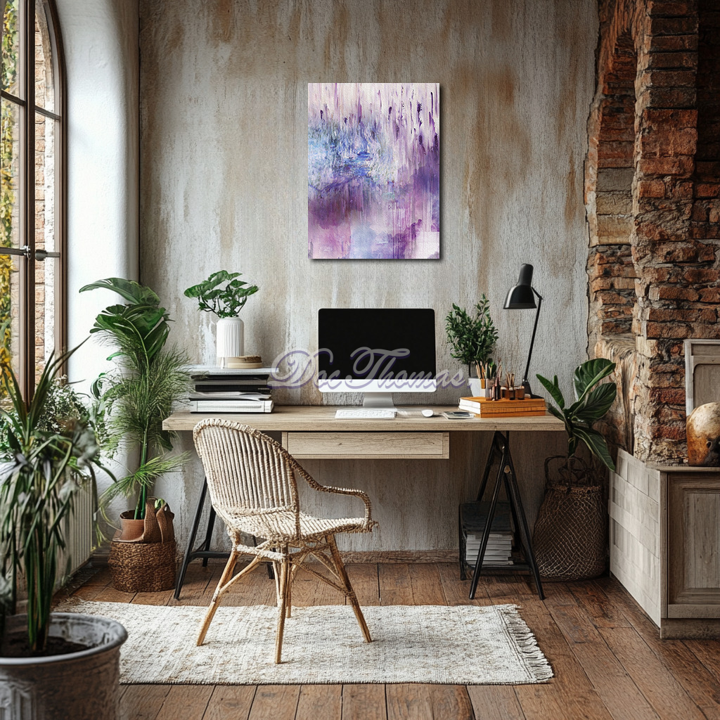 This artwork asks to be felt more than seen. It is meant to wash over the viewer slowly, like fog lifting in reverse. The drips do not fall—they float. The center of the piece, where the faint remnants of a pond remain, is where peace rests quietly. Around it, the haze of violet holds both the history of grief and the beginning of transformation. Nothing here is loud. Everything is in a gentle descent.
