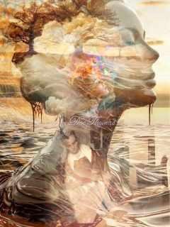 Color in this artwork flows like breath. The honey-gold sky stretches outward, evoking not just light but warmth—an elemental glow of remembrance. Its tones of amber and flax soften the starkness of awakening, offering the viewer a suspended dawn where the soul rests unjudged. The water beneath her, a mirror of molten bronze and cooled steel, suggests the subconscious—reflective, layered, infinite. And within this sea, the Vermeer girl gently floats, cradled by the mind’s inner tides. Above her, trees grow not from ground, but from thought—emerging from the crown of the larger feminine figure like living synapses. These arboreal forms twist in umber and burnt sienna, their roots made not of soil but of time.