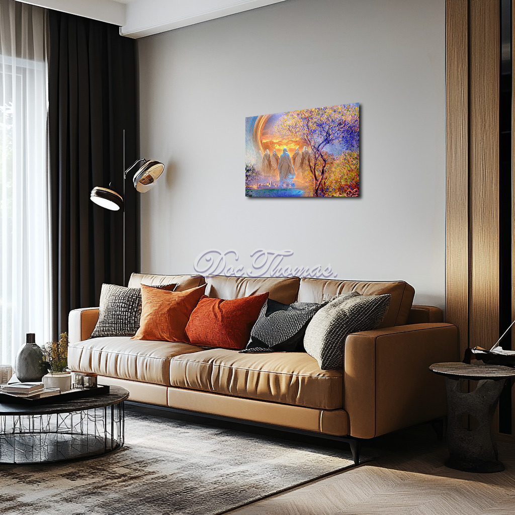 However, within this serene landscape, a supernatural phenomenon unfolds. Cloaked figures—reminiscent of travelers from another realm—walk toward an immense, glowing gateway suspended in the sky. Their presence introduces a surreal, almost prophetic element to the composition. Are they beings from a distant future? Spirits returning to the past? Or pilgrims venturing into a cosmic unknown? Their robes flow as if caught in an invisible current, reinforcing a sense of movement and purpose. They walk in unity, neither hurried nor hesitant, as though following a predestined path.