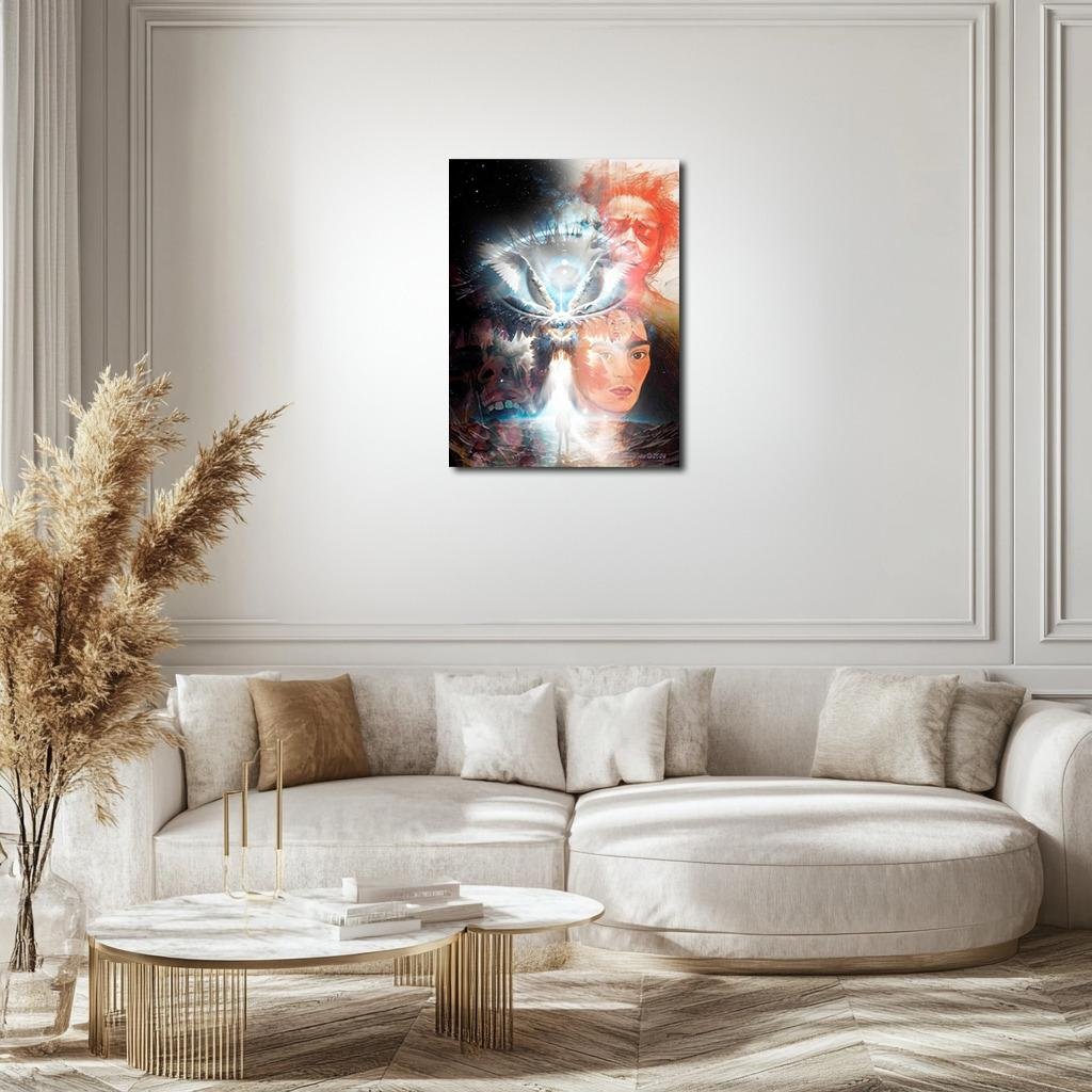 Eye of the Storm reimagines Frida Kahlo’s Diego and I as a cosmic implosion where grief, betrayal, and transcendence collide. Centered on a blinding eye unfurling wings across a sky of searing whites, cyan storms, and bruised seas, the piece transforms Kahlo’s agony into a celestial rupture. Through violent reds, celestial blues, and a piercing shaft of light, Frida’s heartbreak becomes not just a private wound but a mythic force reshaping the universe.