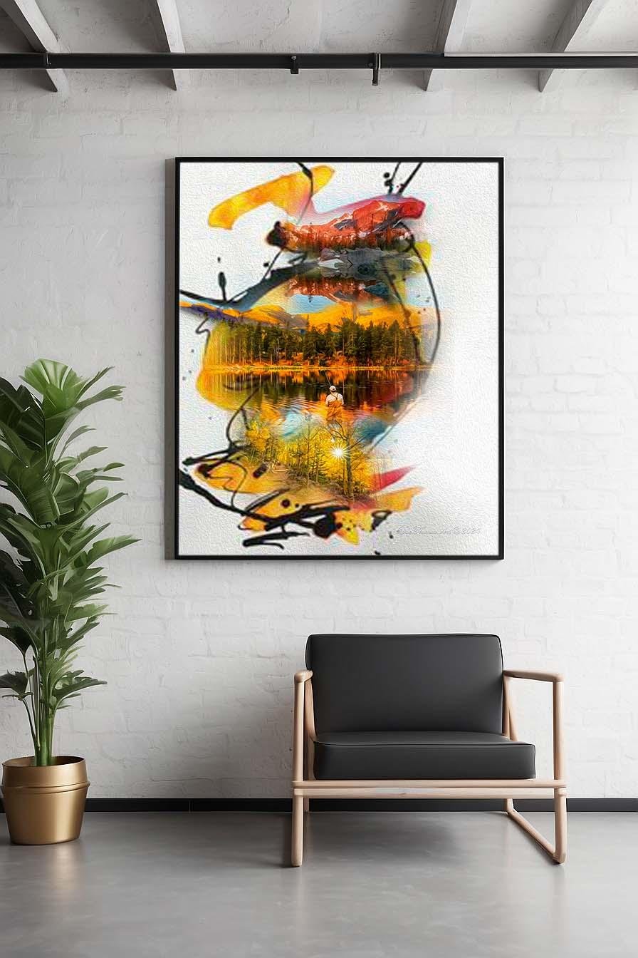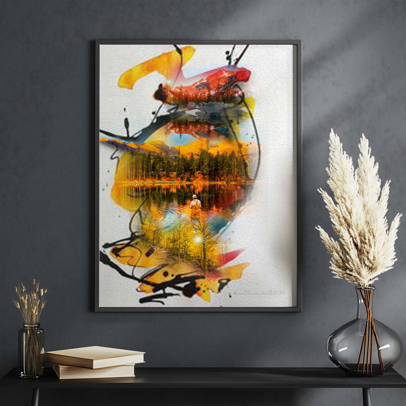 This image evokes a deep sense of peace, reflection, and connection. The mountain reflection creates a mirror image that invites the viewer to pause and consider their place in the world, while the autumn colors remind us of the beauty of change and the passage of time. The fly fisherman adds a personal touch, symbolizing the joy of being fully immersed in nature, free from distraction. The abstract brushstrokes offer a dynamic energy that contrasts with the calmness of the scene, reminding us that even in moments of stillness, there is life, movement, and creativity.