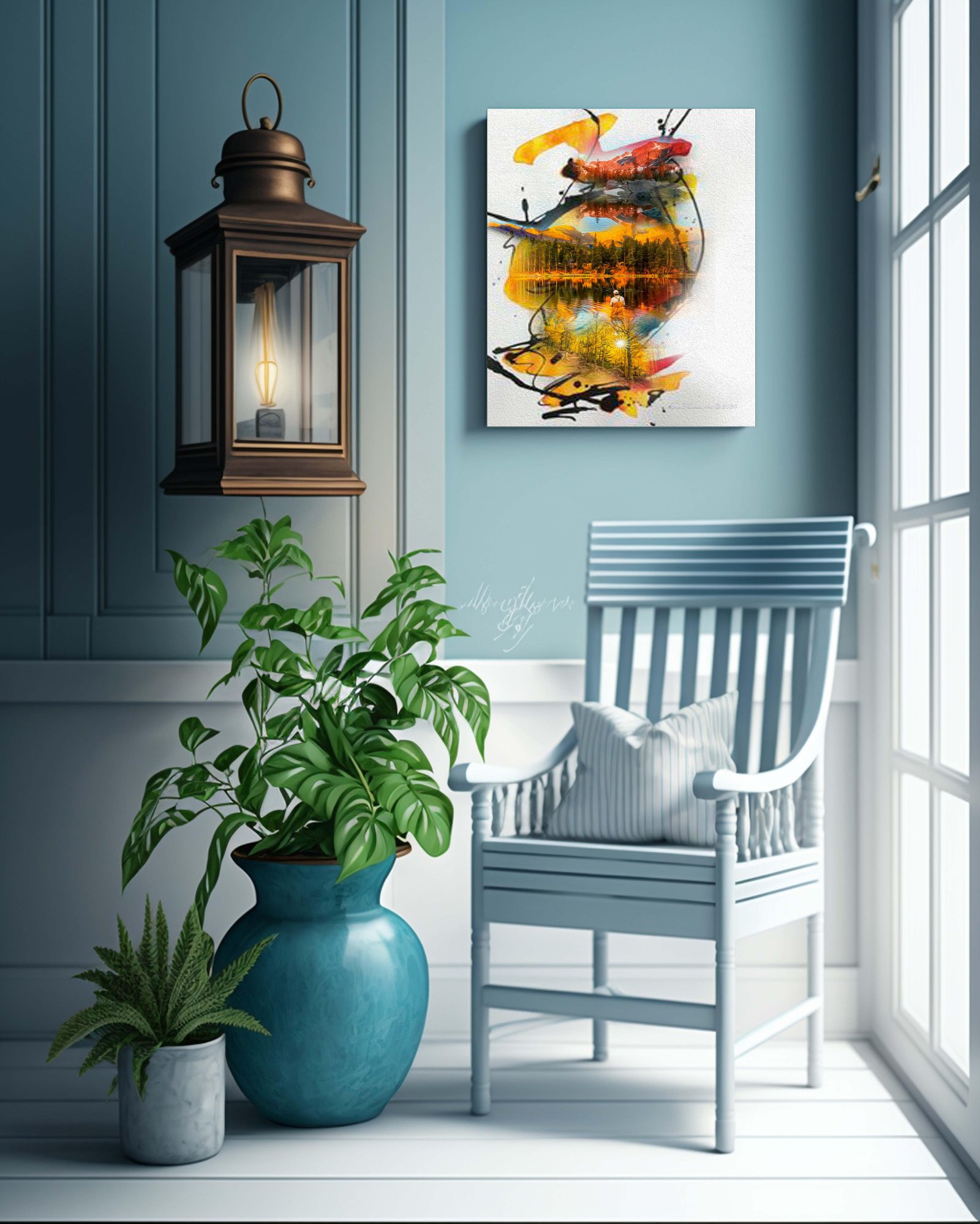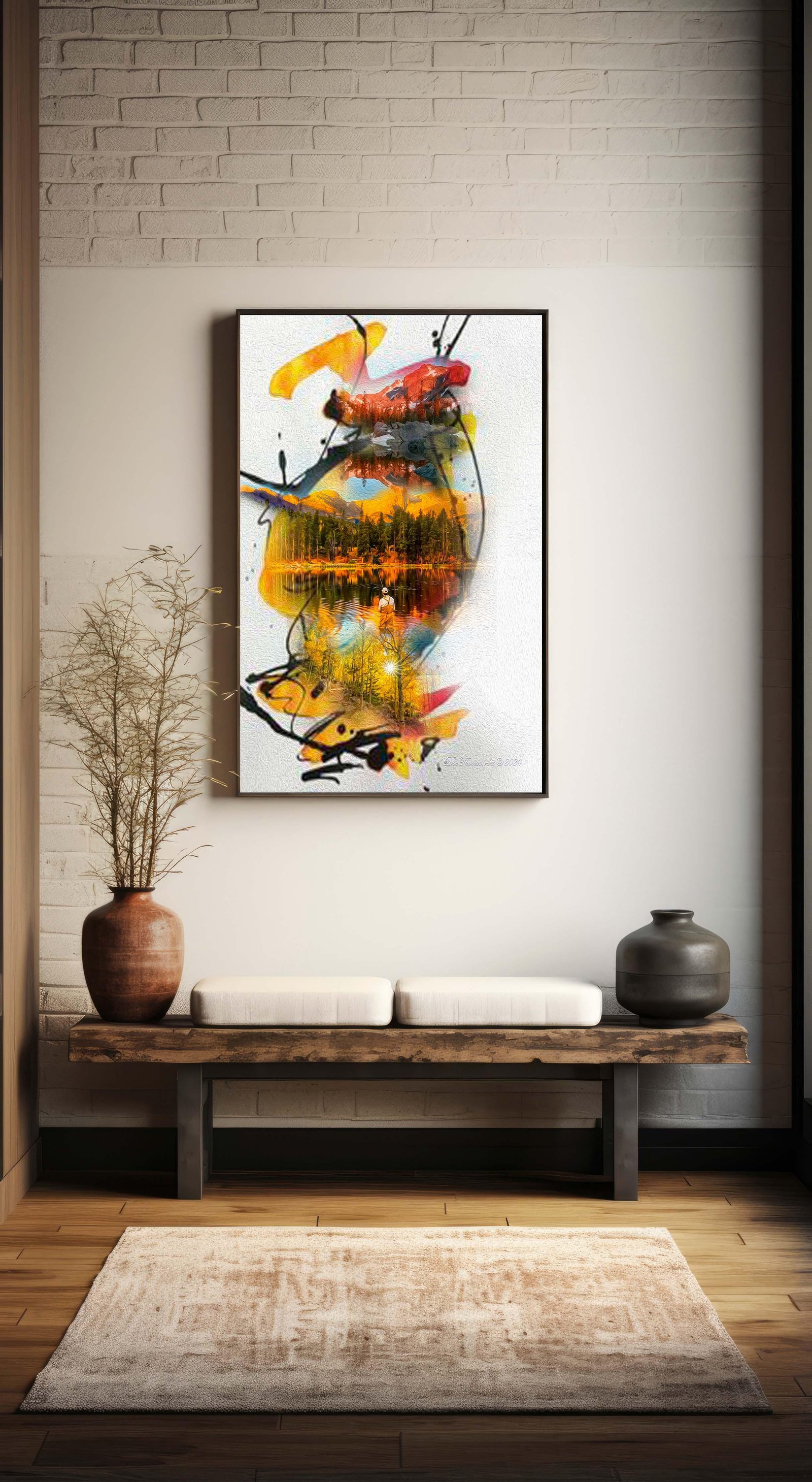In creating this piece, I sought to blend the peacefulness of nature with the energy of abstract expressionism, where the natural world becomes a living canvas. The mountain reflection on the lake serves as the central focus, reminding us of the stillness and clarity that nature can offer. The towering mountains , reflected perfectly in the water, symbolize strength, majesty, and timelessness, grounding the image in the raw beauty of the Rocky Mountains .