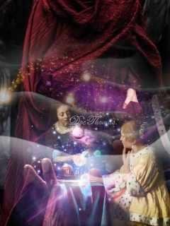 Color becomes the language of transformation in this reimagined scene. The deep crimson folds of the background figure suggest ancient mysticism, the priestess archetype, the unseen hand that watches and guides. This red is not only warmth—it is knowledge wrapped in ritual. It bleeds downward into the composition, fading into twilight purples and midnight blues that carry the cool tension of uncertainty, of decisions that cannot be undone. These hues surround the glowing planets and particles that float between the mistress and maid—like the physical embodiment of thought, doubt, and hidden intention.